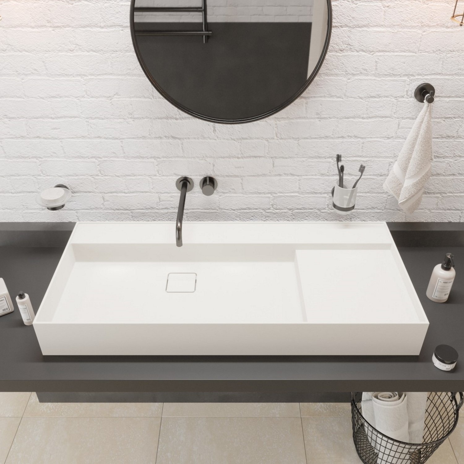 Deze opbouw waskom is geproduceerd in de kleur mat wit en heeft een rechthoekige vorm. De hoogte van deze waskom bedraagt 12 cm, de diepte 45 cm en de breedte 100 cm. Het matte, fluweelachtige oppervlak van de wasbak voelt prettig aan en is makkelijk schoon te maken en te onderhouden.