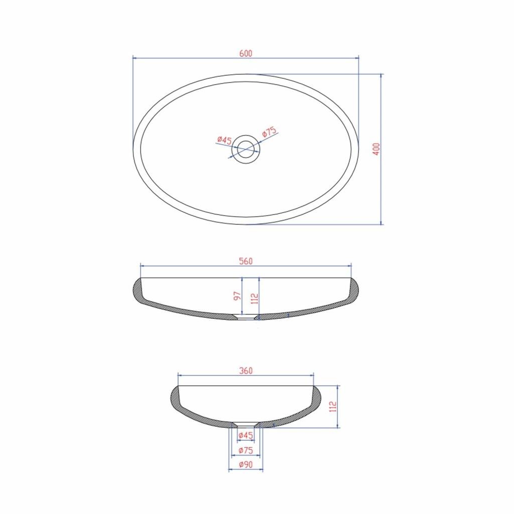 Deze opbouw waskom is geproduceerd in de kleur mat wit en heeft een ovale vorm. De hoogte van deze waskom bedraagt 11,2 cm, de diepte 40 cm en de breedte 60 cm. Het matte, fluweelachtige oppervlak van de wasbak voelt prettig aan en is makkelijk schoon te maken en te onderhouden.