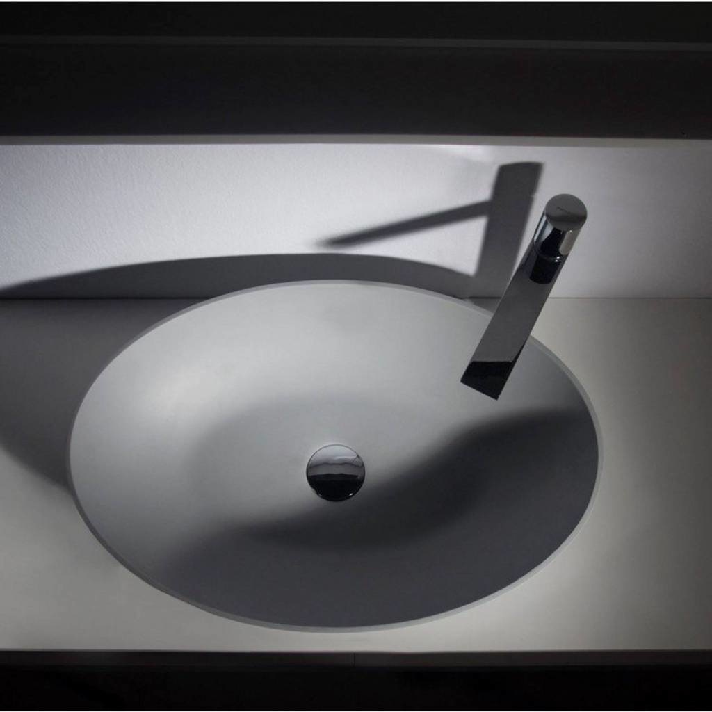 De vrijstaande wasbak in Mat Licht Grijs met een dunne rand van 6 mm. Het matte, fluweelachtige oppervlak van de wasbak voelt prettig aan en is makkelijk schoon te maken en te onderhouden