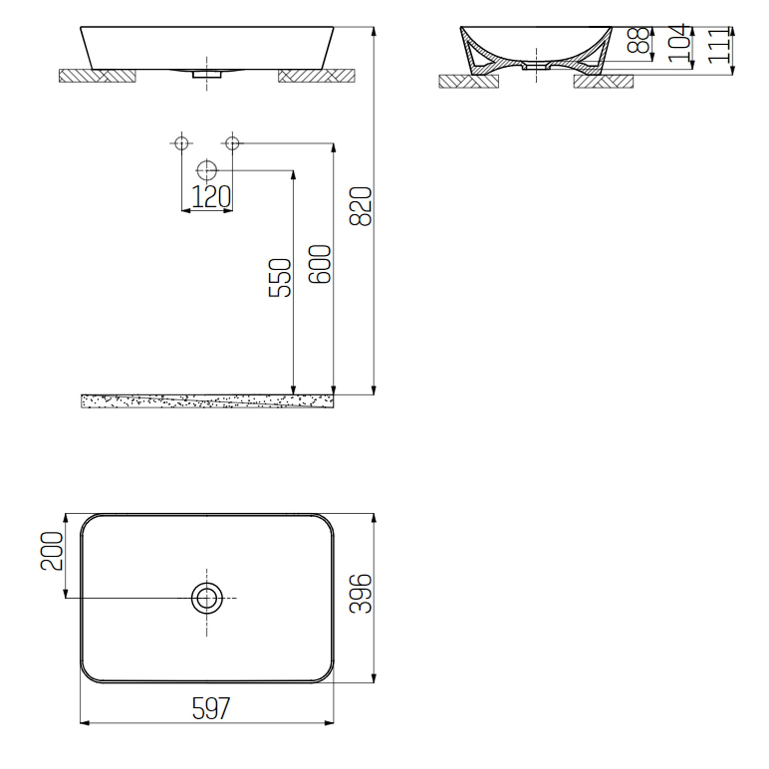 De waskom heeft een breedte van 59,7 cm, een diepte van 39,6 cm en een hoogte van 11,1 cm. De waskom beschikt niet over een kraangat of overloop. De wastafel is gemaakt van keramiek wat ervoor zorgt dat deze makkelijk in onderhoud is. Keramiek is een hard gebakken materiaal, vuil zal hier niet intrekken. Dit alles zorgt ervoor dat het materiaal hygiënisch is en zijn kleur goed zal behouden.