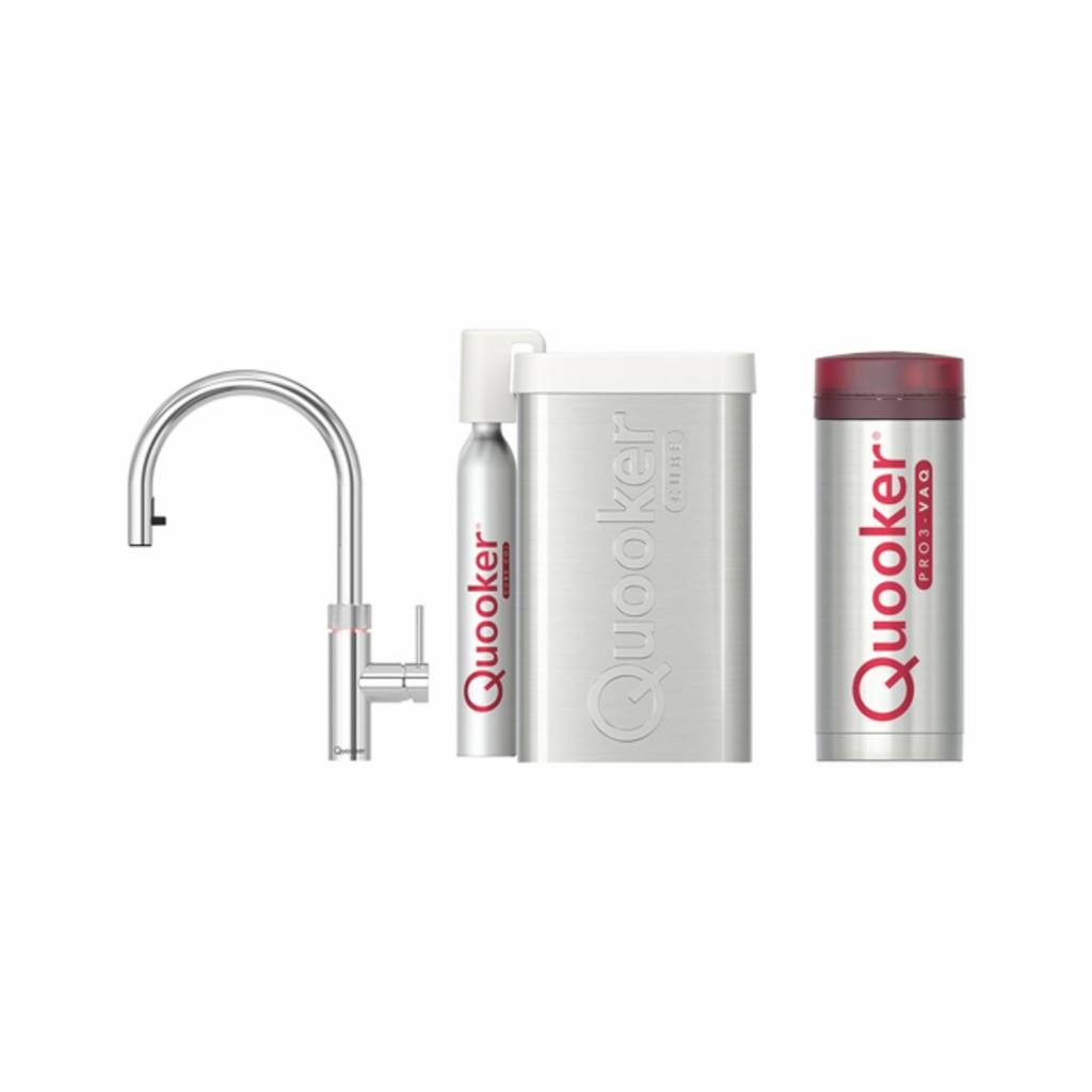 De CUBE bestelt u samen met één van de Quooker-kranen en -reservoirs. Standaard levert Quooker één CO2-cilinder mee voor bruisend water. Als de waterstraal zwakker wordt en er minder koolzuur in het water zit, is de cilinder aan vervanging toe. U bestelt eenvoudig een set van vier nieuwe via de Quooker webshop. De oude vier cilinders stuurt u kosteloos retour aan Quooker via PostNL.