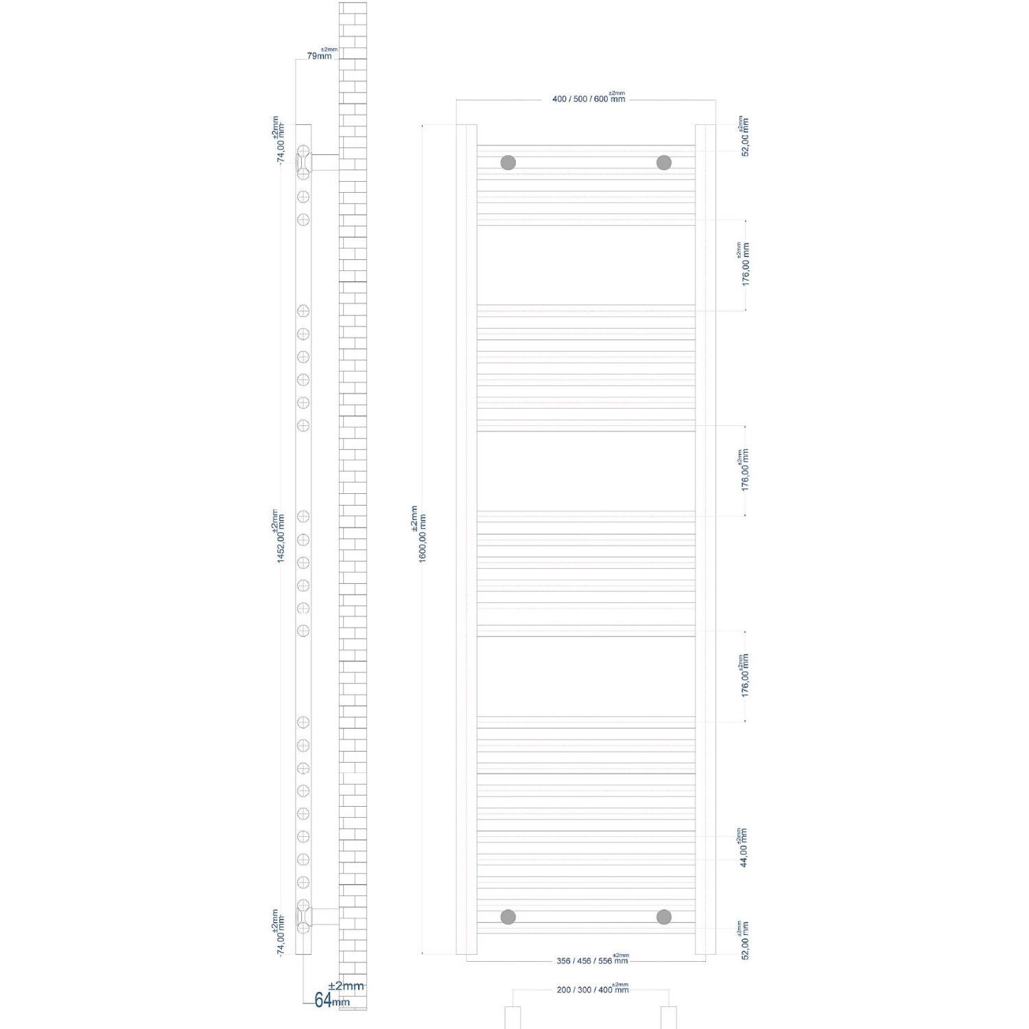 Dit model is verkrijgbaar in lengtes van 80 cm, 100 cm, 120 cm, 140 cm, 160 cm en 180 cm. Daarnaast is deze radiator verkrijgbaar in breedtes van 40 cm, 50 cm en 60 cm. Dus hoe dan ook is er een geschikt model voor uw badkamer. Let goed op dat u de juiste radiator besteld voor de grootte van uw badkamer. Zie de afbeeldingen voor meer uitleg over hoe u dit kan berekenen.