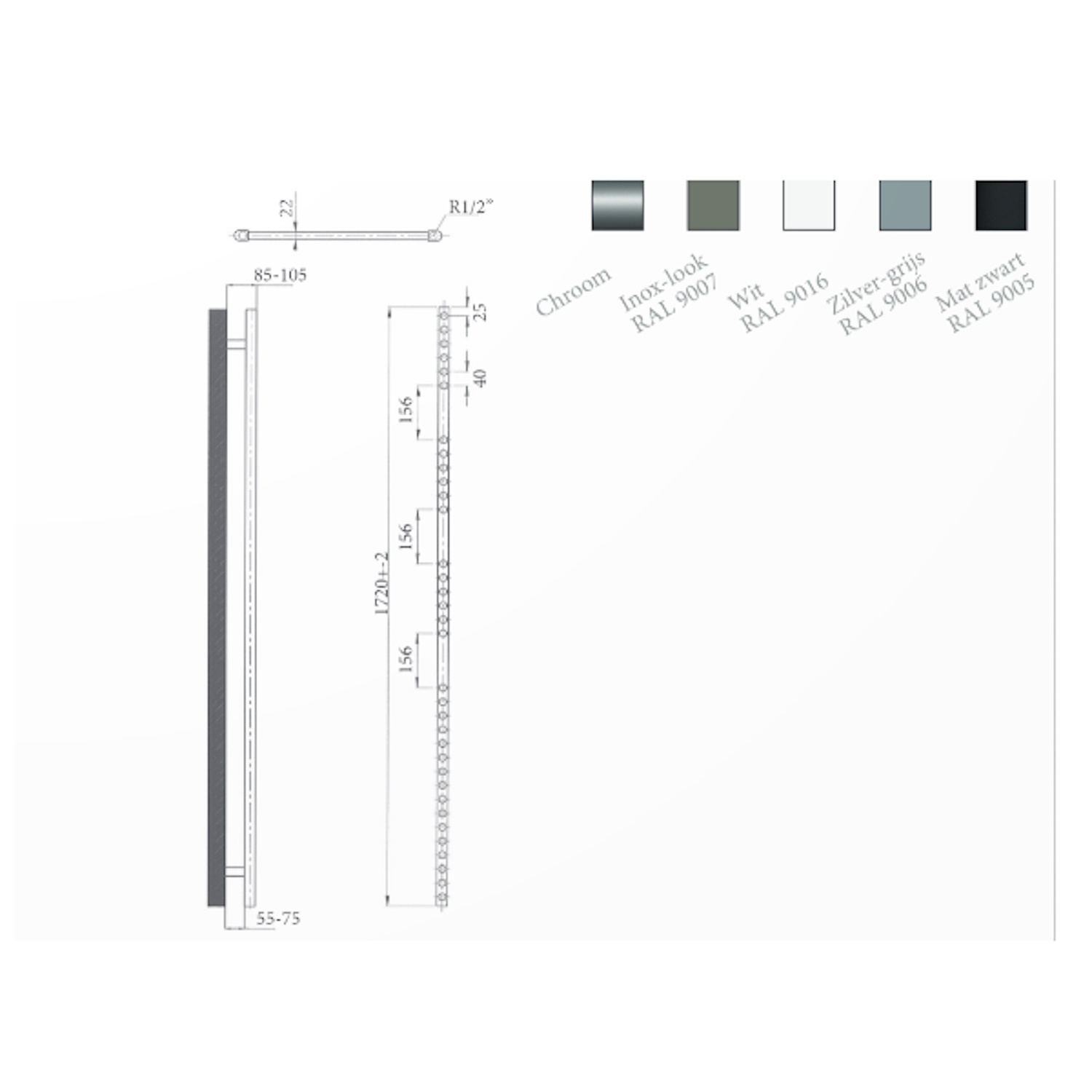 De radiator heeft een hoogte van 172 cm en een breedte van 60 cm. De radiator is te bestellen in de kleuren wit, Gunmetal, inox-look, zilver-grijs en zwart. De thermostaten zijn in de kleuren chroom, zwart en wit te verkrijgen.