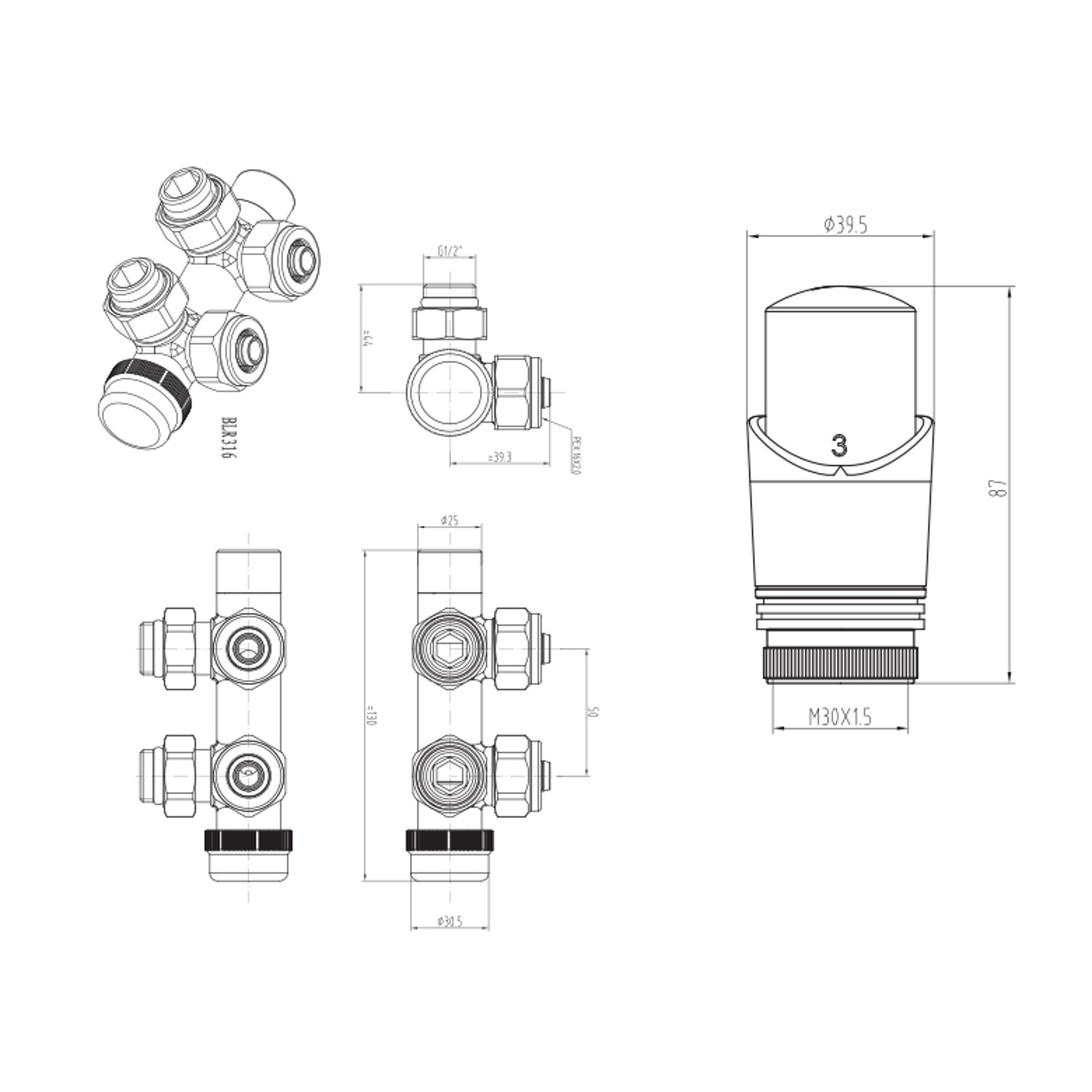 De set komt met een haaks onderblok, een thermostaat knop en twee verloopringen met een schroefdraad van 3/4 inch naar 1/2 inch.