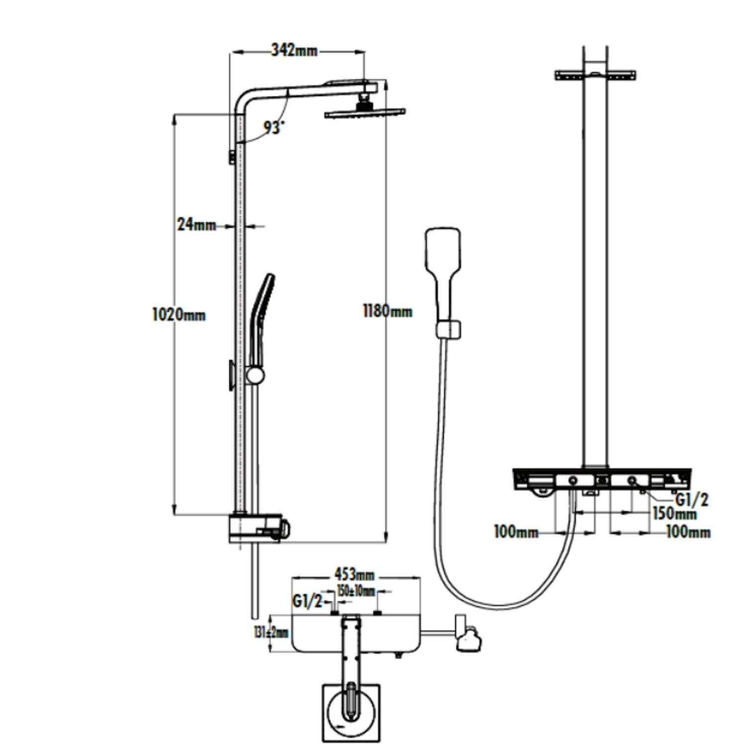 Het planchet heeft een diepte van 13,1 cm en een breedte van 45,3 cm. De hoofddouche zelf is vierkant en heeft een afmeting van 20,3x20,3 cm.