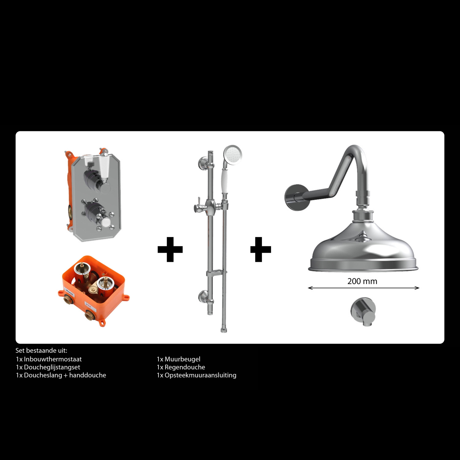 Zowel de regendouche, bedieningsplaat en handdouchehouder dienen aan de wand te worden bevestigd. De bedieningsplaat beschikt over twee knoppen waarmee de douche aan- en uit wordt gezet. Ook is er een omstelknop aanwezig om van regendouche naar hoofddouche te switchen en weer terug.