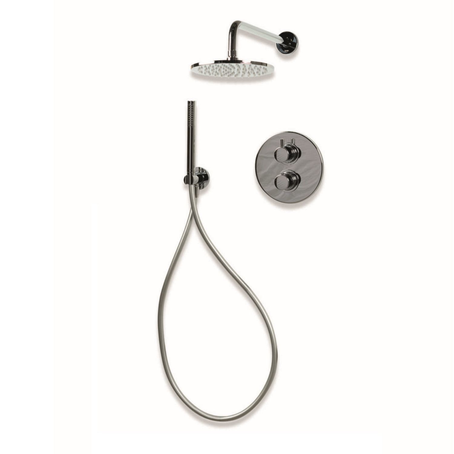 Deze set bestaat uit een hoofddouche, handdouche met handdouchehouder, een muurarm en een thermostaatkraan met afdekplaat. De afdekplaat heeft een diameter van 18,5 cm. De hoofddouche heeft een afmeting van 20 cm. De handdouche is 19 cm lang.