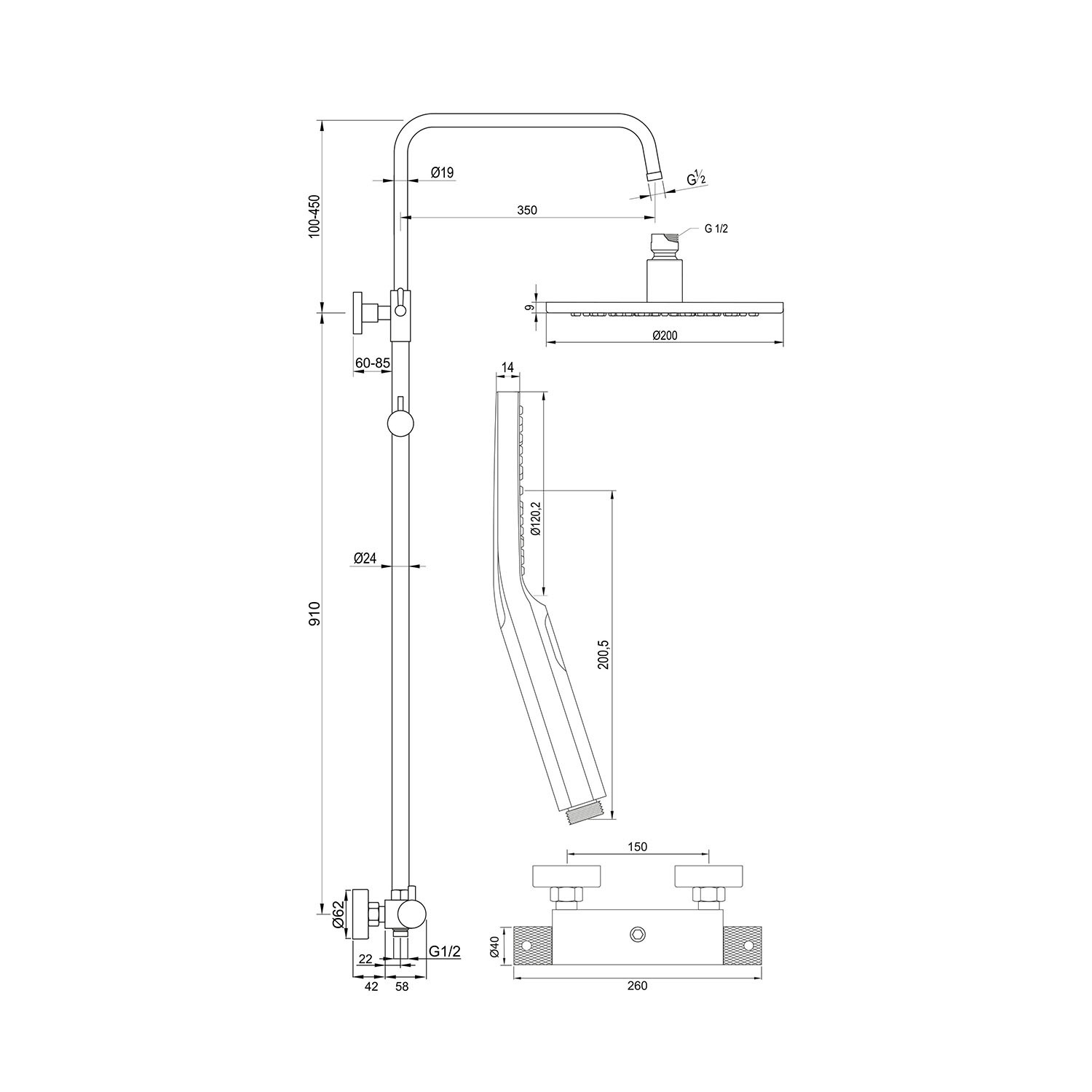 Deze set bestaat uit een complete opbouw regendoucheset met thermostaatkraan, handdouche (met 3 standen) en regendouche van 20 cm. De thermostaatkraan is eenvoudig te bedienen. Met de linkerdraaiknop bepaalt u de gewenste douchestand en daarmee wisselt u tussen hoofd- en handdouche. Met de rechter draaiknop stelt u de gewenste watertemperatuur in. Deze knop is voorzien van temperatuurblokkering bij 38°C, zodat de kraan voor iedereen veilig te gebruiken is. De glijstang is verstelbaar tussen 95 en 140 cm