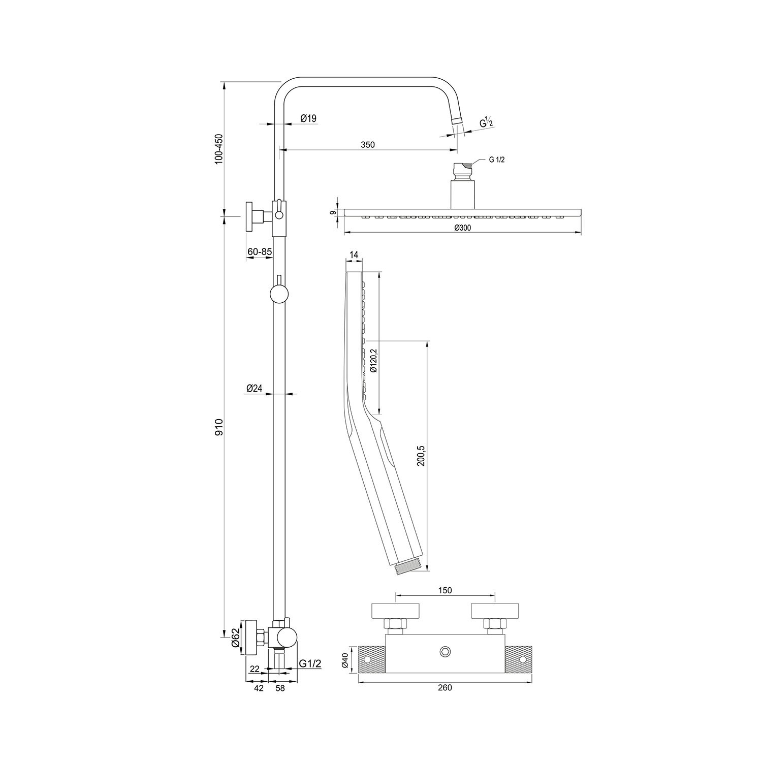Deze set bestaat uit een complete opbouw regendoucheset met thermostaatkraan, handdouche (met 3 standen) en regendouche van 30 cm. De thermostaatkraan is eenvoudig te bedienen. Met de linkerdraaiknop bepaalt u de gewenste douchestand en daarmee wisselt u tussen hoofd- en handdouche. Met de rechter draaiknop stelt u de gewenste watertemperatuur in. Deze knop is voorzien van temperatuurblokkering bij 38°C, zodat de kraan voor iedereen veilig te gebruiken is. De glijstang is verstelbaar tussen 95 en 140 cm