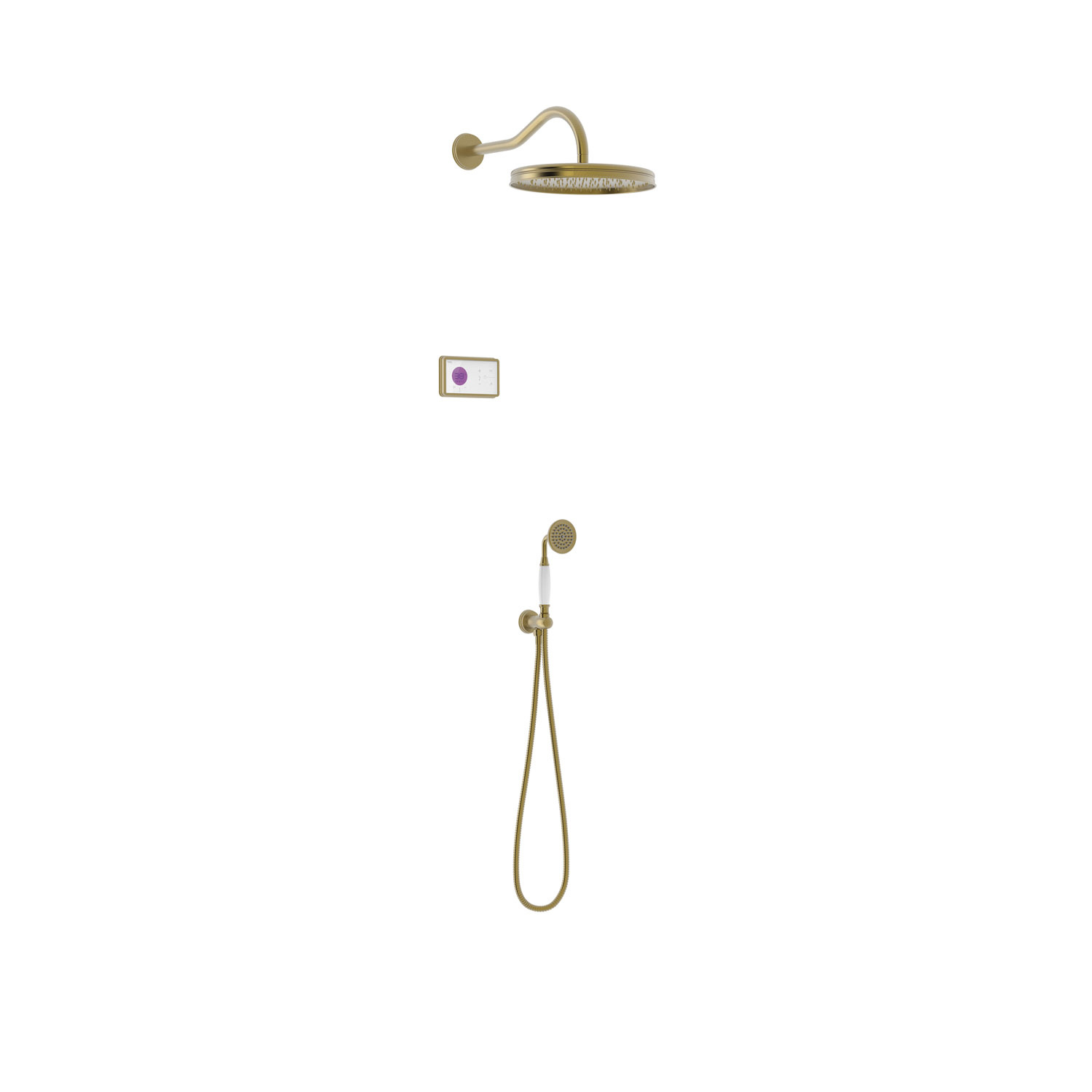Deze regendoucheset van Tres komt uit de Clasic serie. Deze serie bestaat uit allemaal artikelen met een klassieke uitstraling. Dit is inbouwdouche is gemaakt van messing in een Verouderd Messing Mat kleur. De hoofddouche heeft een diameter 31 cm en de antikalk handdouche heeft een diameter van 7.8 cm. De inbouw thermostatische kraan is elektronisch en voorzien van vochtafdichtingen van Schlüter in een witte kleur. Door het keramische binnenwerk behoud deze kraan jarenlang zijn kwaliteit. De lengte van de geribbelde doucheslang is 170 cm. De hoofddouche heeft een uitloop uit de muur.