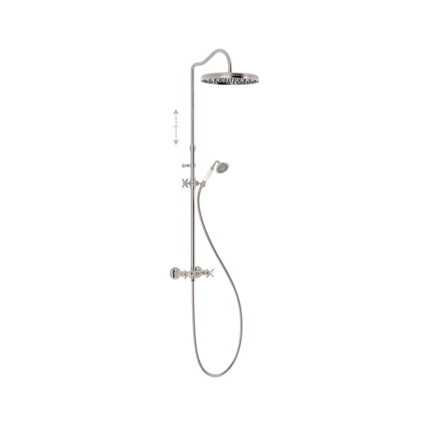 Deze regendouche set van Tres uit de Clasic serie past uitstekend in een klassieke badkamer. De kruisgrepen en de witte details geven de douche een sierlijke look. De hoofddouche heeft een diameter van 31 cm. Deze set in inclusief glijstang, antikalk handdouche en doucheslang. De doucheslang is 170 cm lang. De hoogte van de hoofddouche is in hoogte te verstellen. Het materiaal is messing uitgevoerd in een rvs kleur.