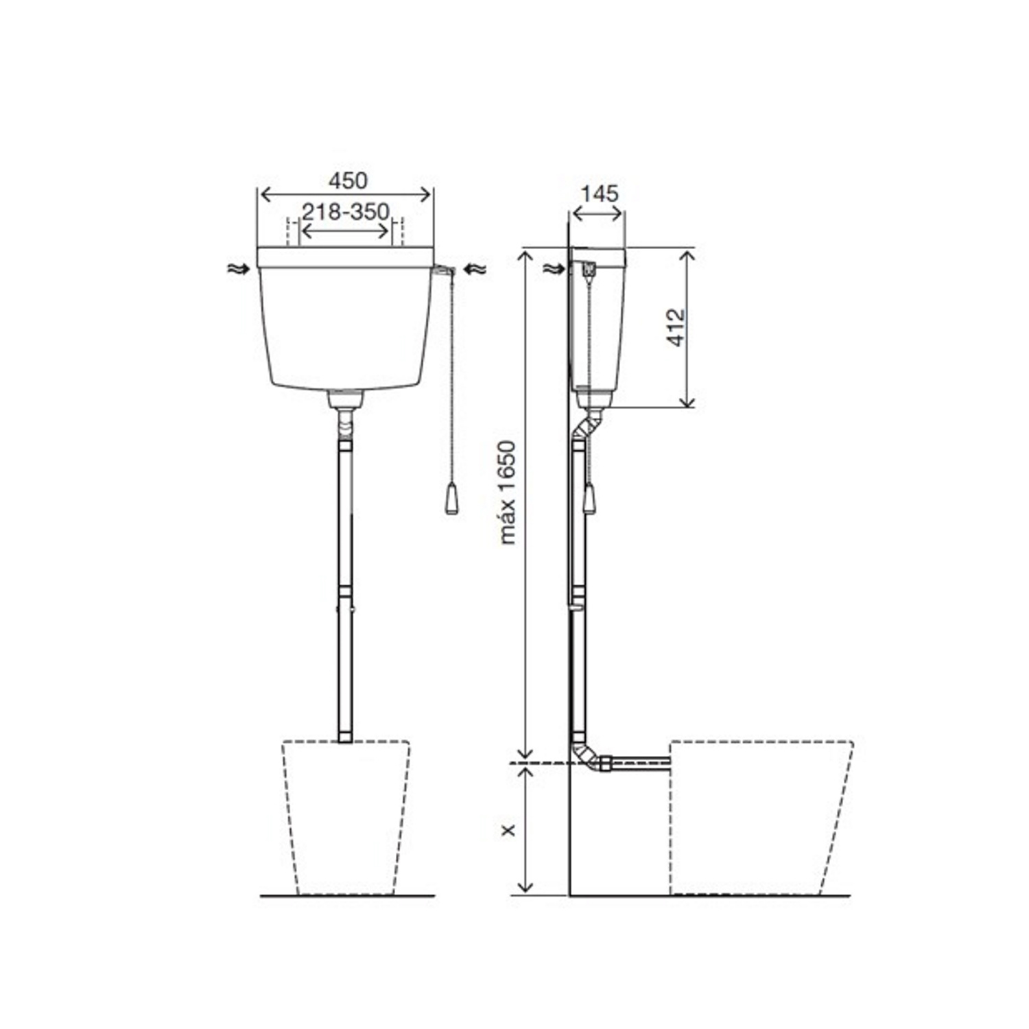 Dit hooghangend kunststof reservoir in wit kan direct aan de muur bevestigd worden boven het toilet en wordt bediend met een closettrekker. Het reservoir heeft een inhoud van 9 liter maar kan, indien gewenst, ook aangepast worden naar 6 liter en wordt geleverd inclusief muurbevestigingsmateriaal, 4 modulaire valpijpen met een diameter van 32 mm en een rubber ring voor aansluiting op de toiletpot.