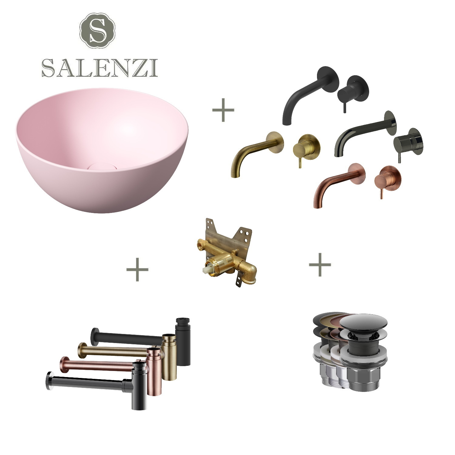 Een complete waskomset van het merk Salenzi inclusief waskom, wastafelkraan, inbouwdeel, clickwaste (optioneel) en sifon. De speciale eigenschappen van het keramiek maakt de waskom van Salenzi ontzettend sterk en daarnaast extra hygiënisch. Het keramische mengsel wordt gegoten in de gipsen mal. De opbouw wastafelkom wordt gebakken op een temperatuur van 1250 graden, hierdoor ontstaat de prachtige vorm.