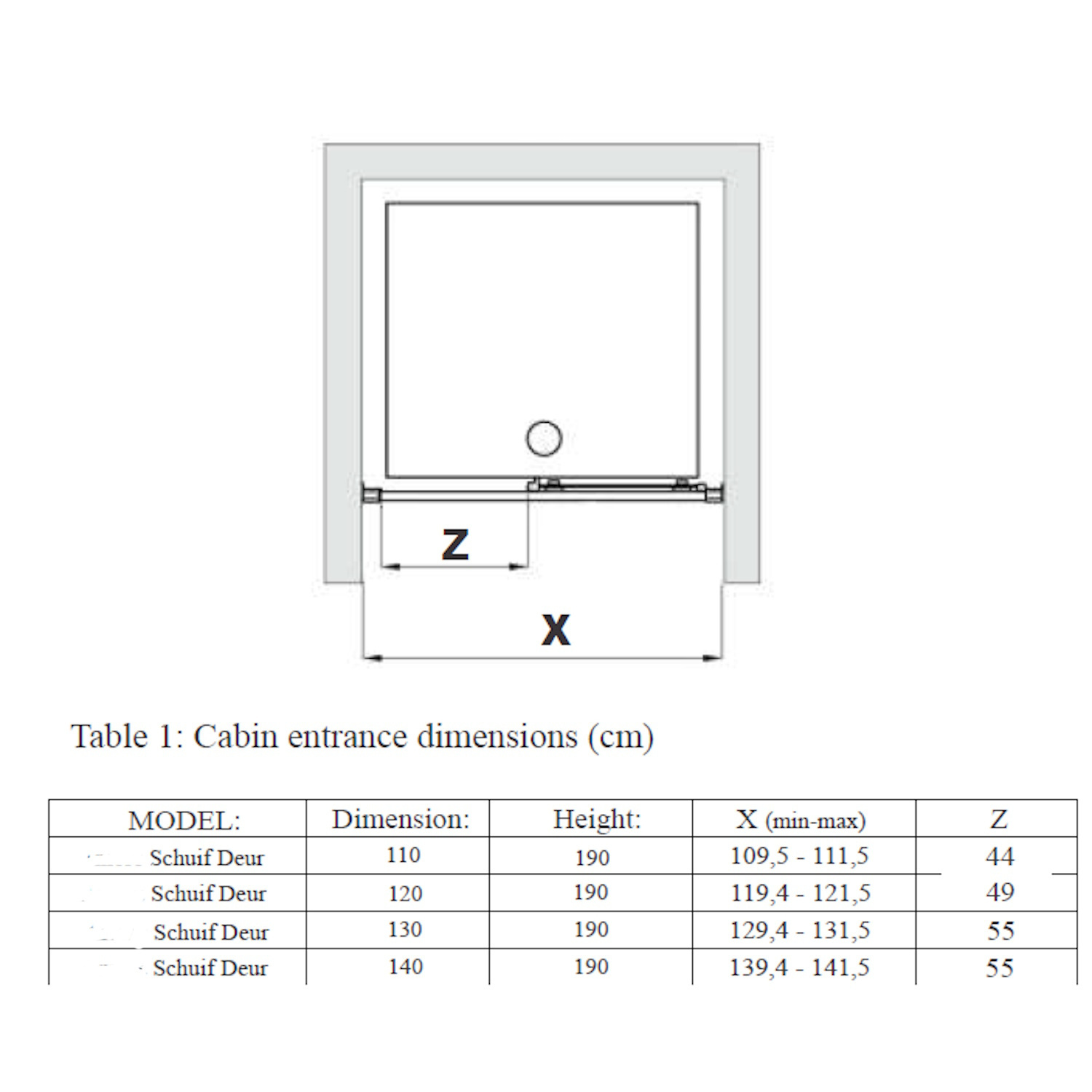 Moderne nisdeur van het merk Boss & Wessing uit de serie Arema. Deze schuifdeur kunt u gemakkelijk plaatsen in de douche en de schuifdeur is gemakkelijk te bedienen door opzij te schuiven. De schuifdeur heeft een zwart profiel.