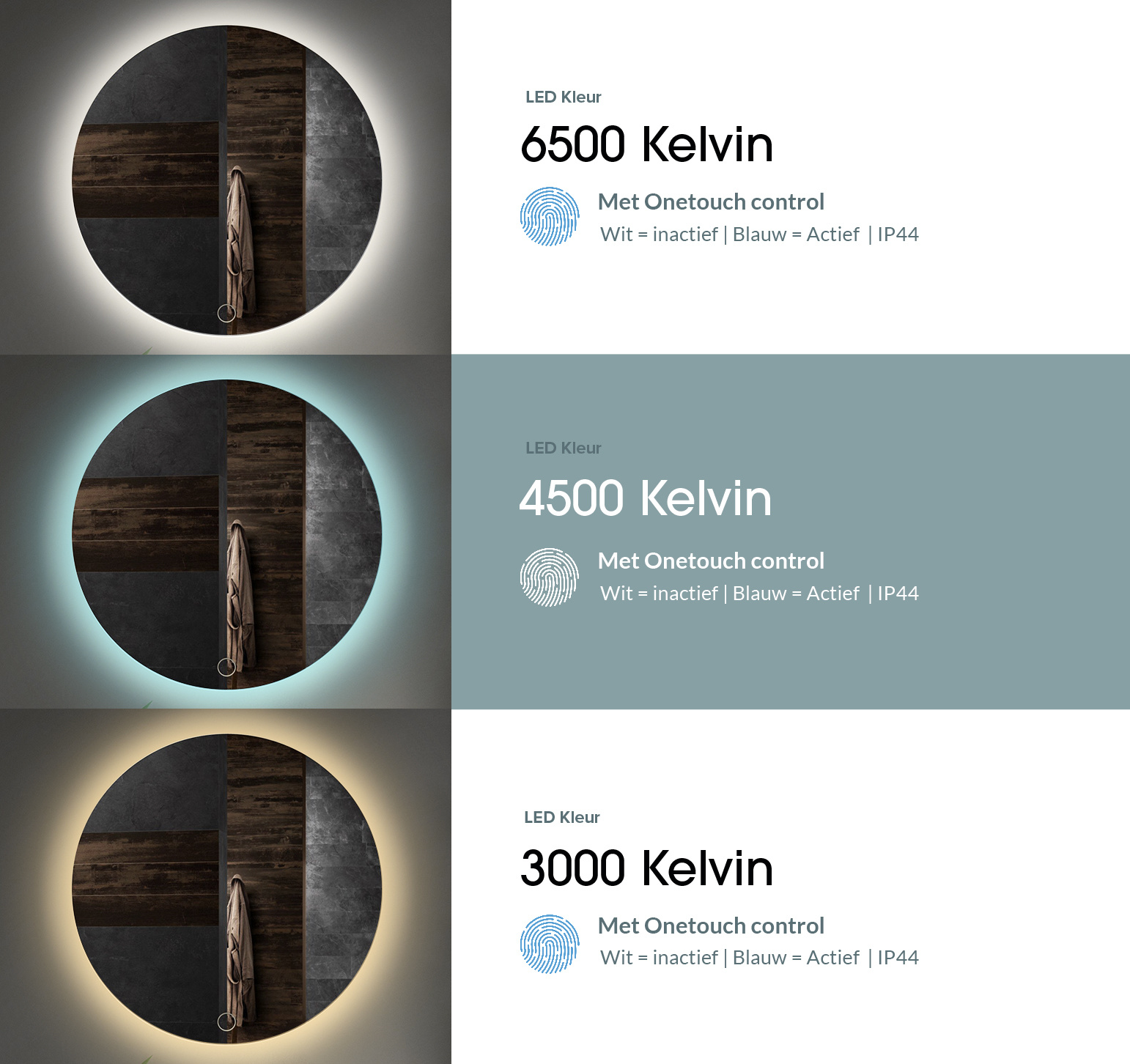 Deze spiegel is voorzien van LED verlichting. De LED verlichting kan in 3 verschillende kleurtinten worden ingesteld: koel wit, helder wit en warm wit. Het licht schijnt op die volgorde met een sterkte van 6500, 4500 of 3000 Kelvin. Deze spiegel kunt u gewoon op de normale stroomtoevoer aansluiten, hij is namelijk voorzien van 2 knoppen. Met de ene knop zet u de spiegel aan of uit en met de andere knop kunt u de spiegelverwarming in en uitschakelen.