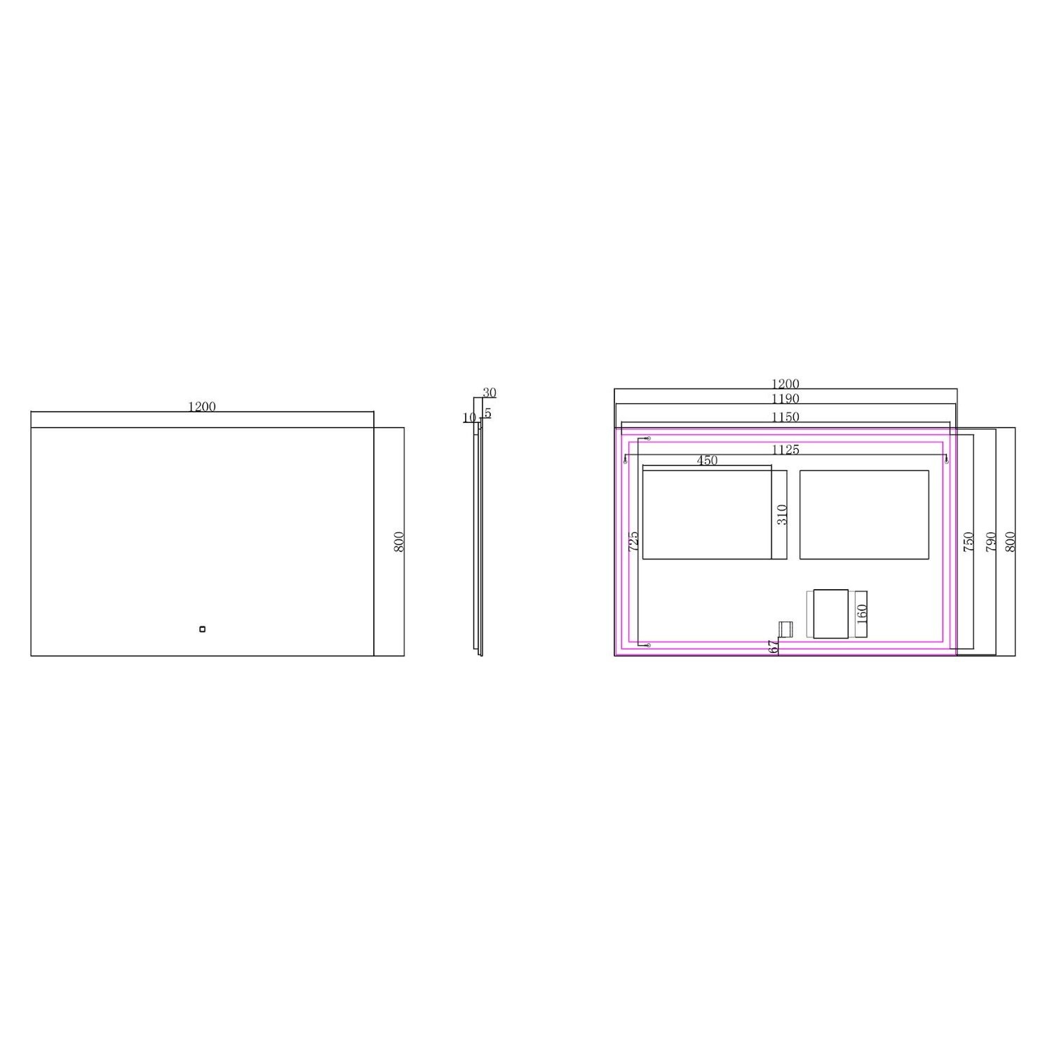 De spiegel is 120 cm breed en 80 cm lang.