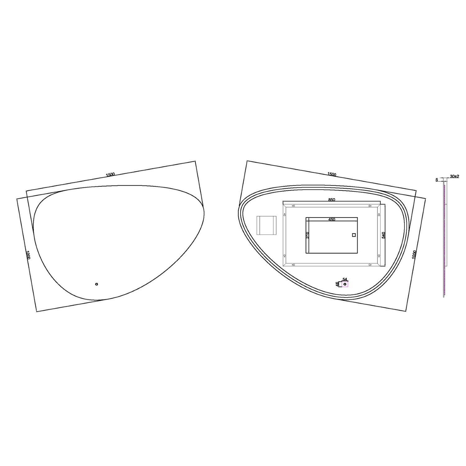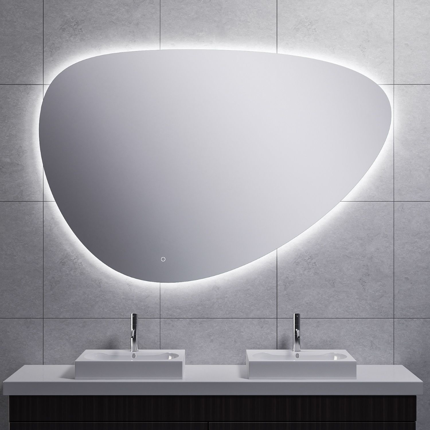 De badkamerspiegel heeft een unieke organische vorm en heeft een breedte van 150 cm.
