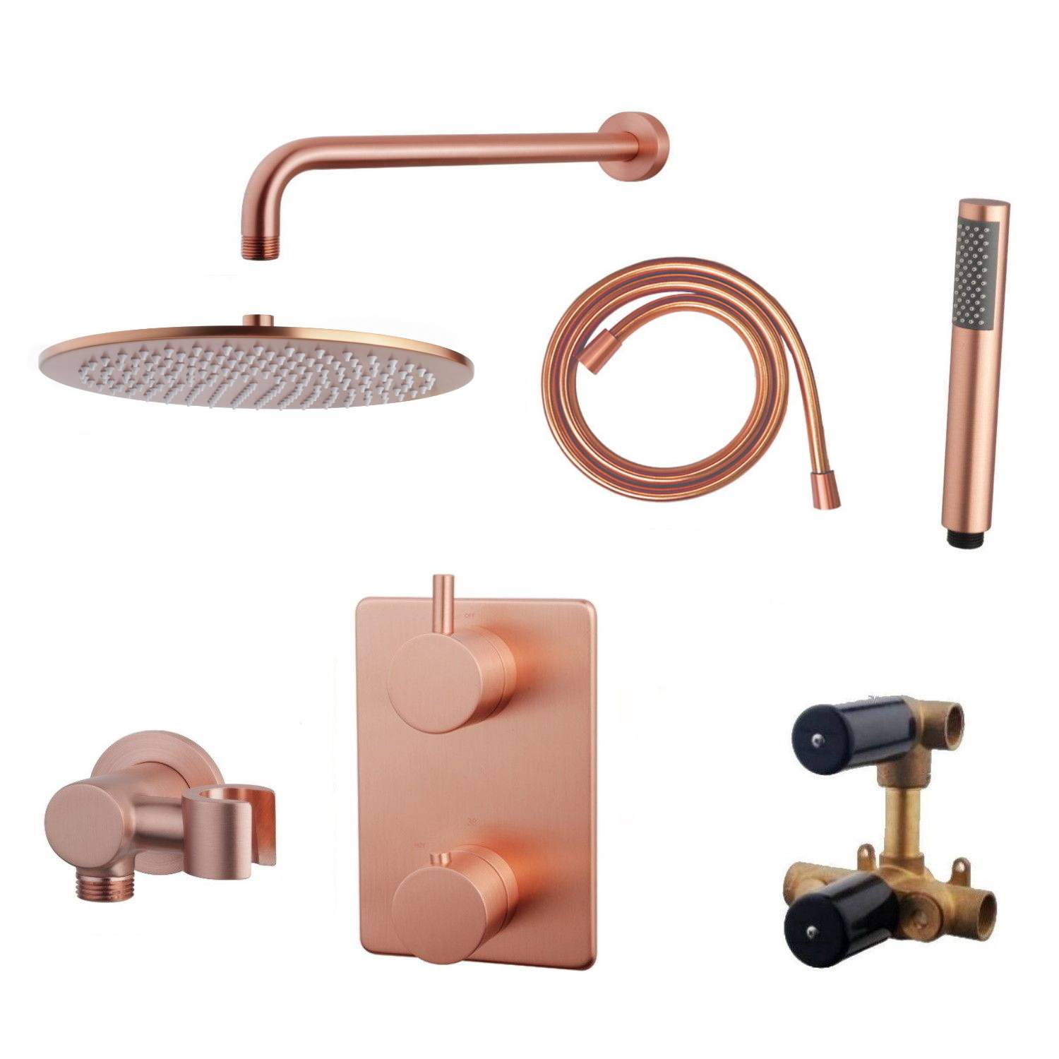 Deze inbouwthermostaatset van het merk Aqua Splash bevat alle onderdelen voor een fijne douche! De inbouwset bestaat uit een hoofddouche, muuruitloop, afbouwdeel inbouwthermostaat, handdouche, wandhouder, doucheslang en douchethermostaat. De set heeft een prachtige koperen kleur met een geborstelde afwerking.