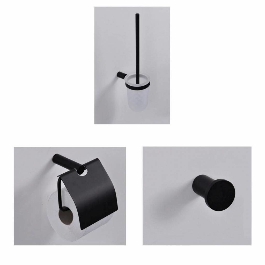 Met een toilet accessoire set heeft u in één keer uw toilet voorzien van toiletgarnituur. De set bestaan uit een wc borstel, toiletrolhouder en handdoekhaak. De accessoires zijn gemaakt van mat zwart messing. Dit materiaal is zeer geschikt om te gebruiken in badkamers en natte ruimtes.