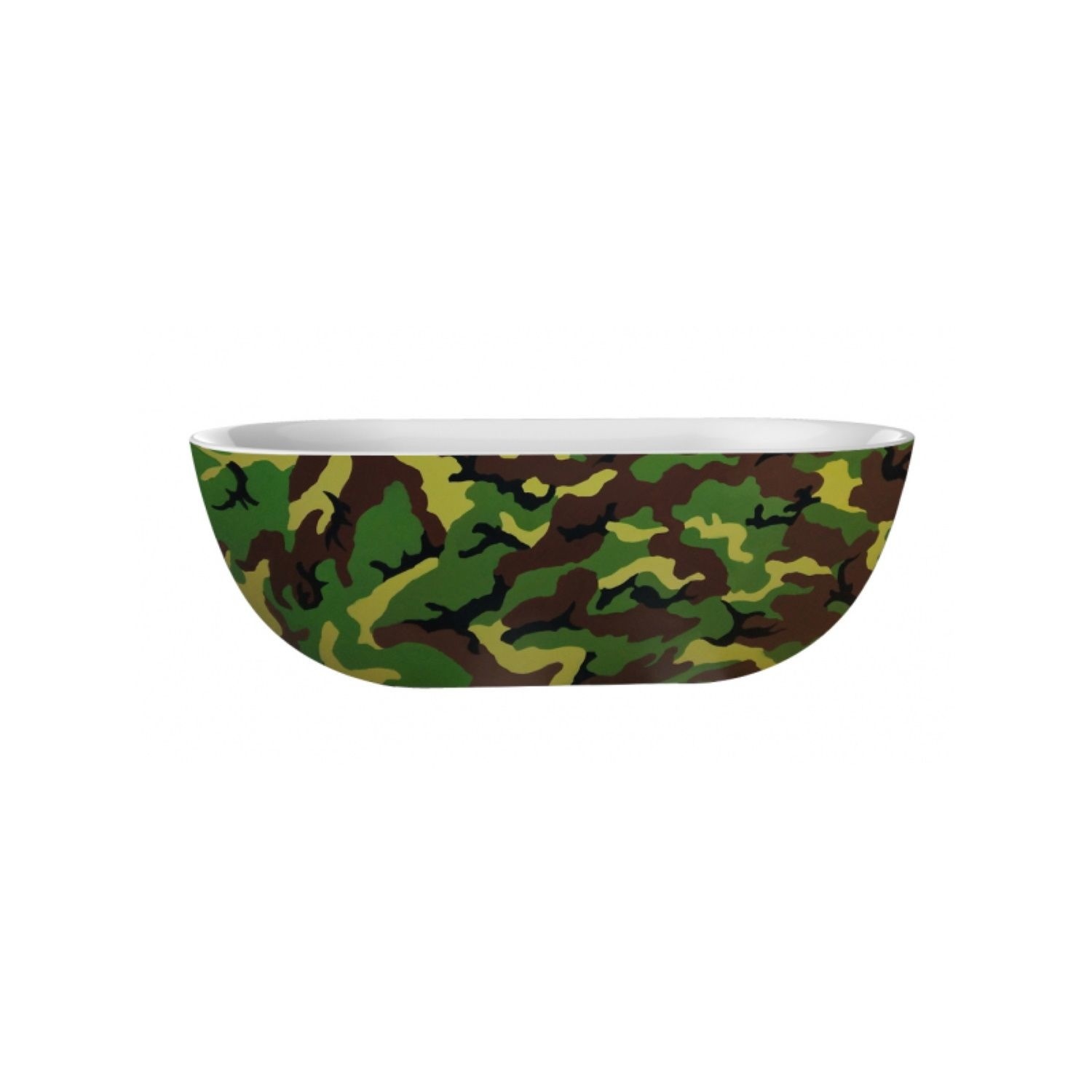 Het bad is te plaatsen met een staande badkraan om zo een totaal vrijstaande badplaats te creëren. Dit bad vergeelt niet door het hoogwaardig acryl en bestaat uit een geheel en heeft dus geen naden. U heeft voldoende ruimte om comfortabel te baden. Ook is dit bad extra uniek door zijn camouflage buitenkant! Aan de binnenzijde heeft het bad een glanzend witte kleur.