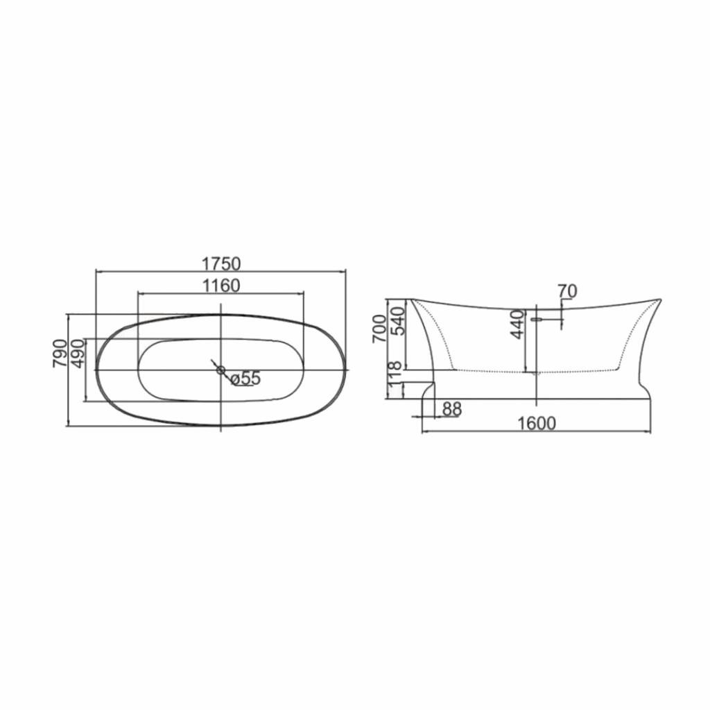 Het bad is 175cm lang en 79cm breed, genoeg om gezellig met zijn tweeën in te zitten. De afvoer zal niet in de weg zitten want die zit netjes in het midden. Er zit overigens een badafvoer bij het bad.
