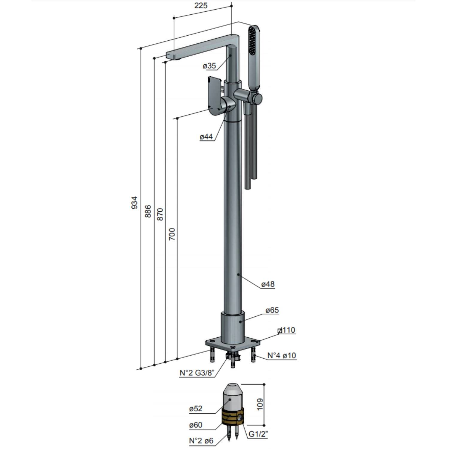 De kraan is 93.4 cm hoog en heeft een uitloop 22.5 cm. De draadaansluiting is 3/8".