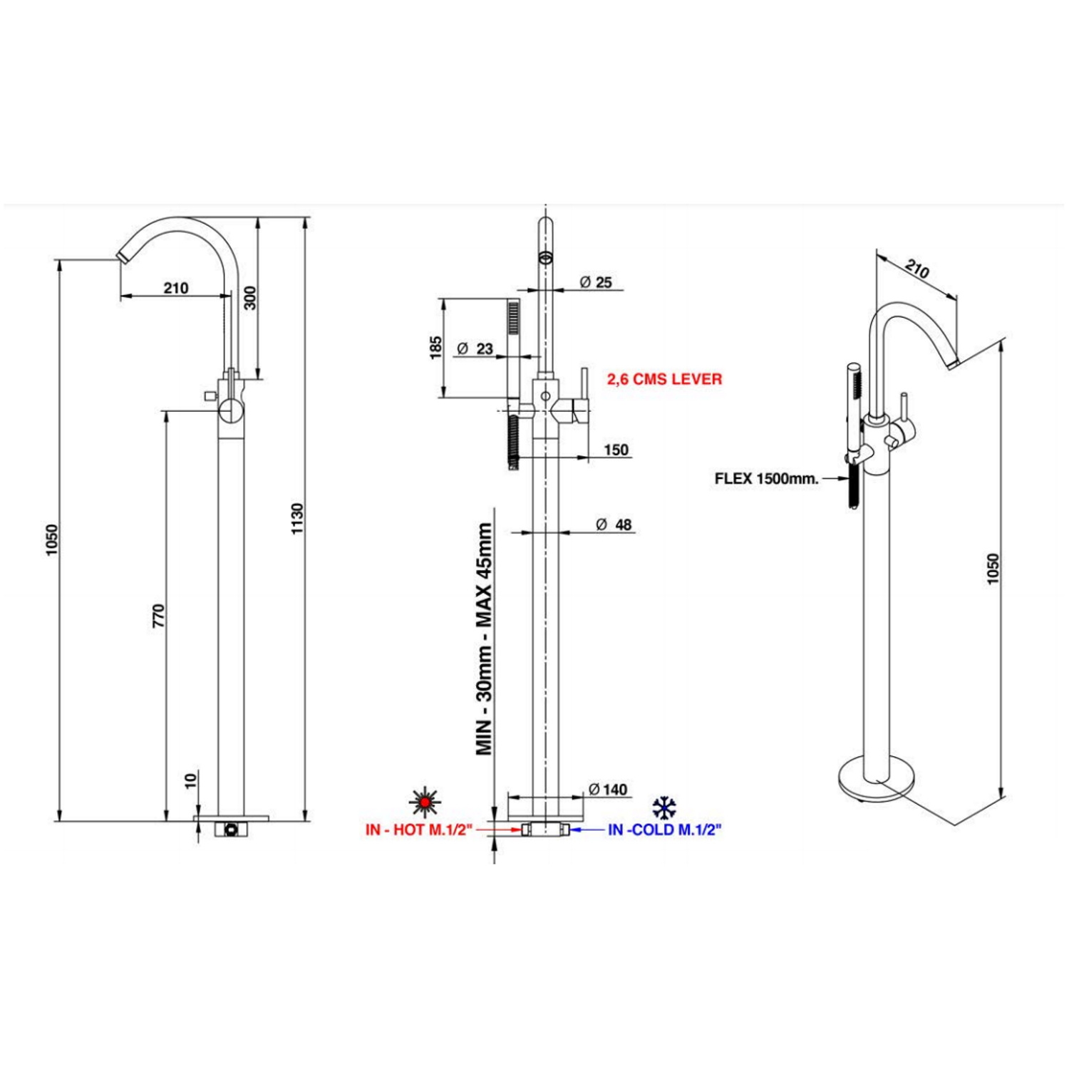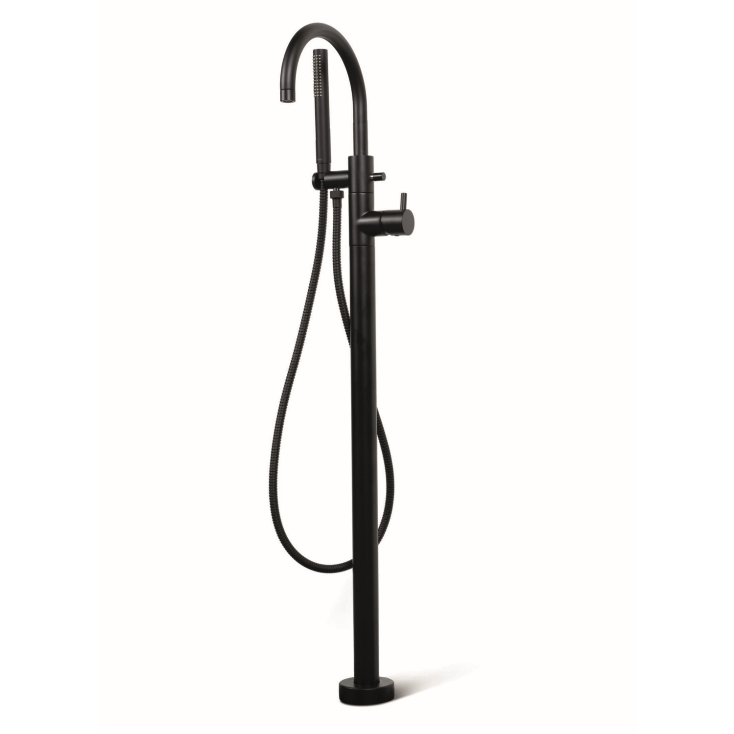 De badkraan heeft een hoogte van 113 cm. de uitloop is 21 cm lang. De bijgeleverde handdouche is 18,5 cm lang. De set is van messing in de kleur Mat Zwart. Het design is een tikkeltje modern, maar vooral tijdloos. Zo kan hij bij iedere stijl worden toegepast.