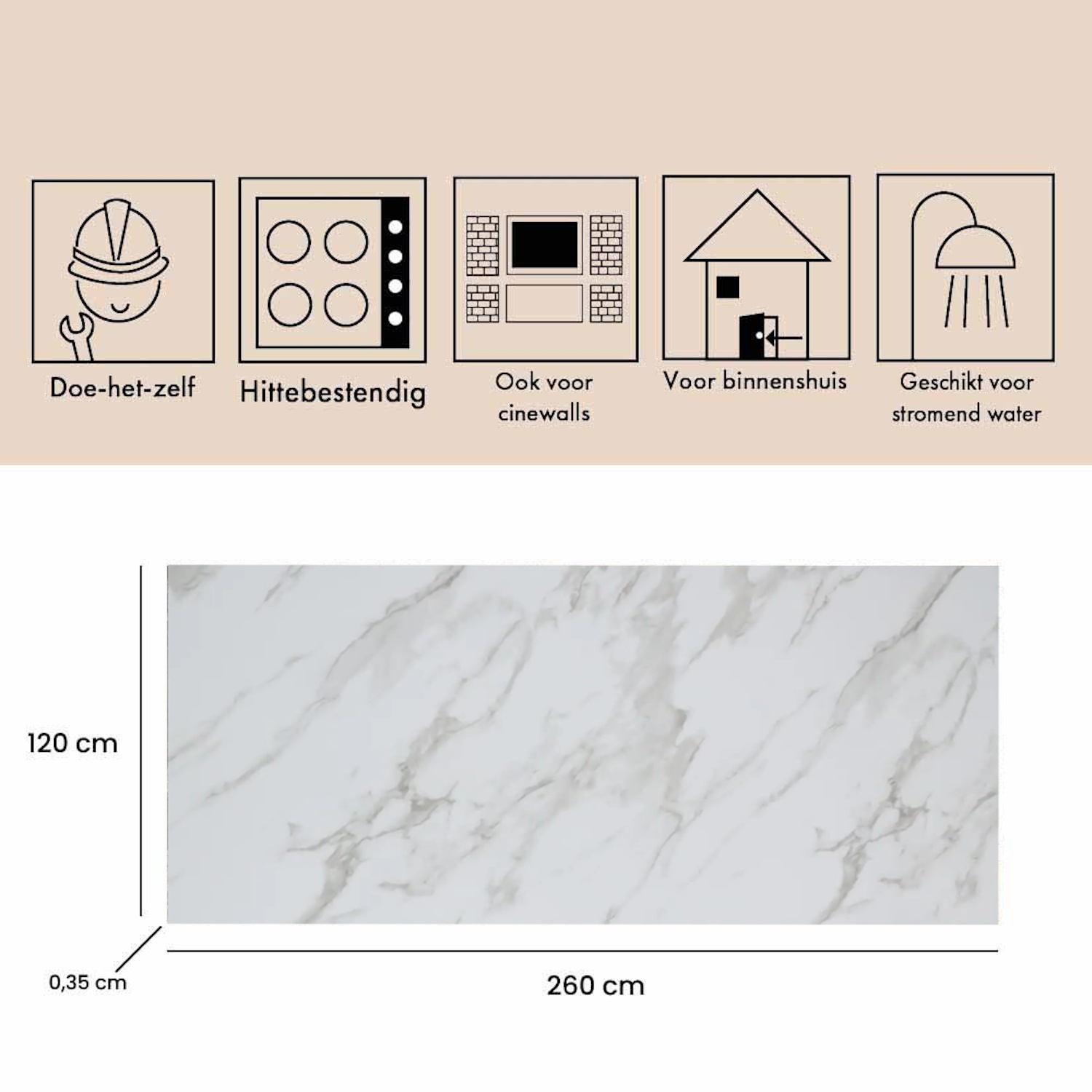 Montage: Deze marmerlook platen zijn gemakkelijk zelf te plaatsen op verschillende ondergronden. Onder andere op oude tegels, gebruik de High Tack montagekit om de platen goed te bevestigen. Gebruik per plaat van 120x260 cm 3 tubes kit om deze te bevestigen. De panelen dienen 48 uur binnen de ruimte geacclimatiseerd te worden voor de montage, vergeet het paneel zelf ook niet te ontvetten!
