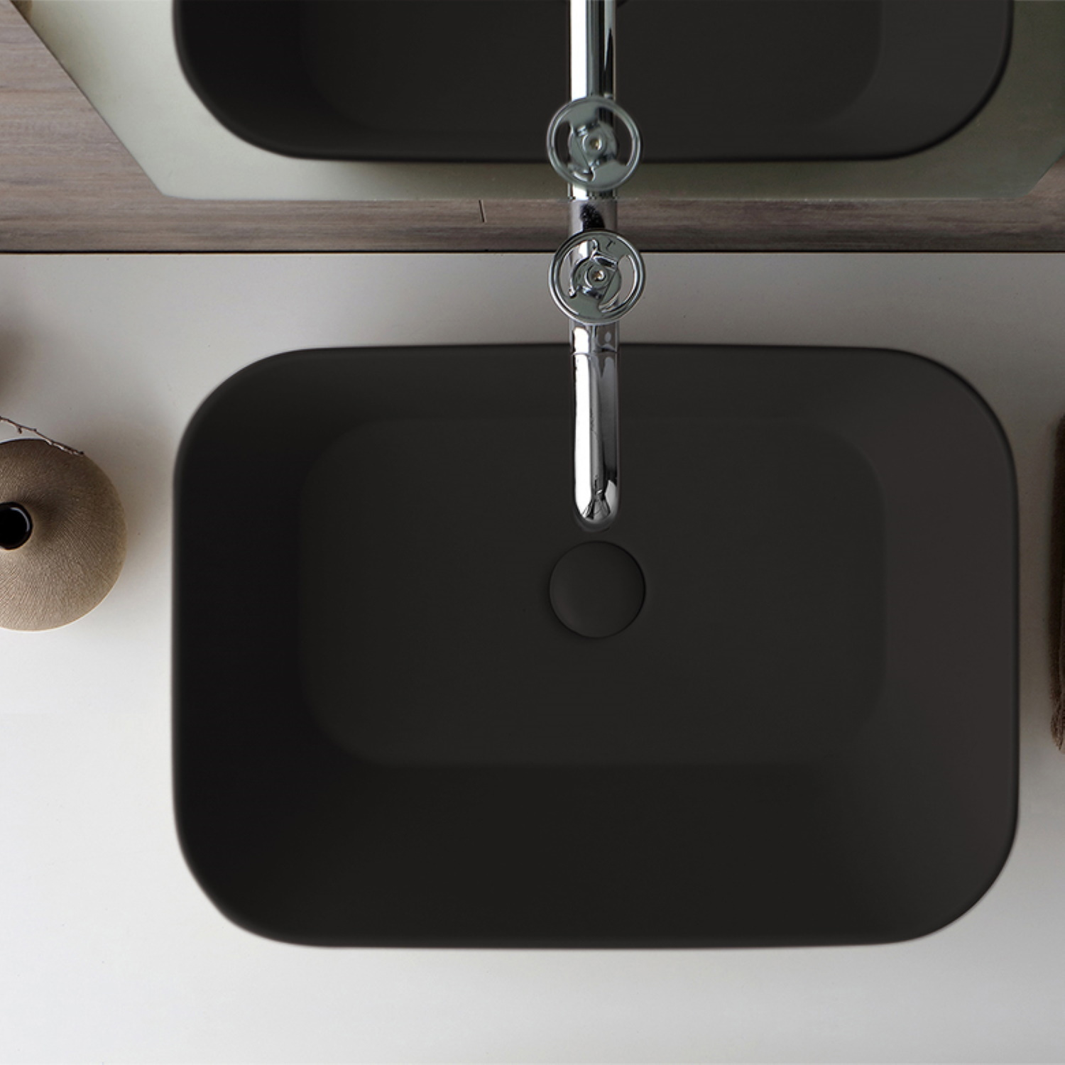 Deze Mees Design opbouw waskom geeft met zijn fraaie mat zwarte uitstraling en unieke vorm een prachtige dimensie aan uw badkamer. Zeker als u de waskom combineert met andere mat zwarte items in uw badkamer. De waskom kent een breedte van 60 cm, diepte van 42 cm en heeft een hoogte van 16.5 cm.