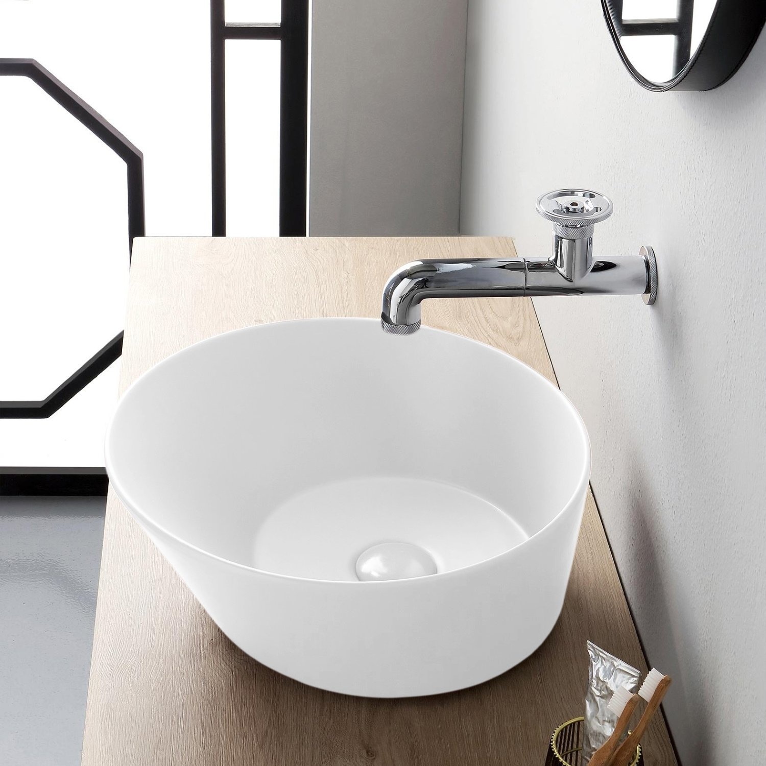 Deze Mees Design opbouw waskom zorgt met zijn fraaie mat witte uitstraling en unieke vorm een moderne look in uw badkamer. Zeker als u de waskom combineert met andere mat witte items in uw badkamer. De waskom kent een diameter van 42 cm en heeft een hoogte van 16.5 cm.