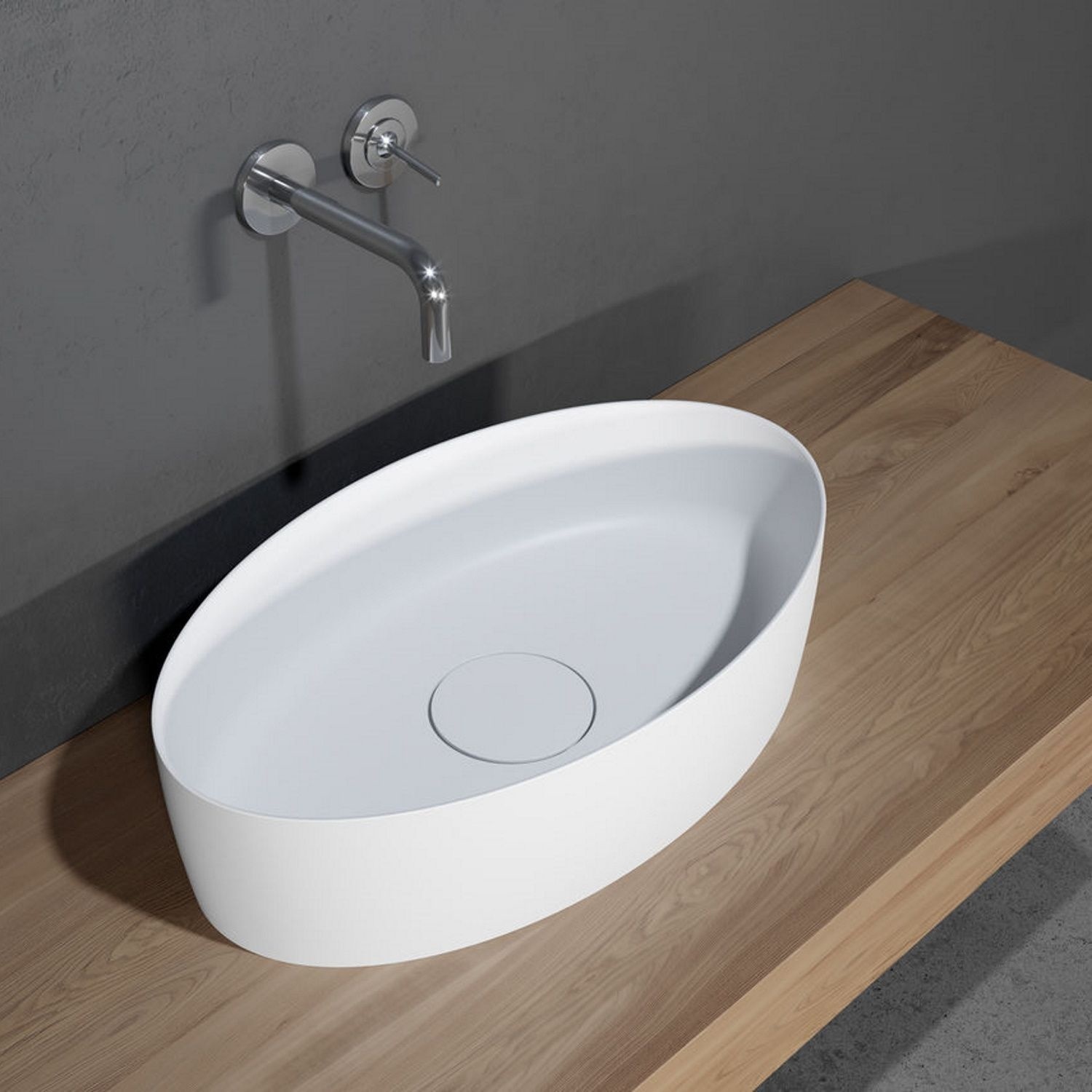 Op zoek naar een waskom van hoogwaardige kwaliteit voor uw wastafel? Dan zijn de waskommen van Riho iets voor u. De Thin waskom heeft een ovaale vorm en is gemaakt van solid surface materiaal. De kom is afgewerkt in mat wit, maar kan goed overgespoten worden in een andere kleur door de structuur van de buitenkant.