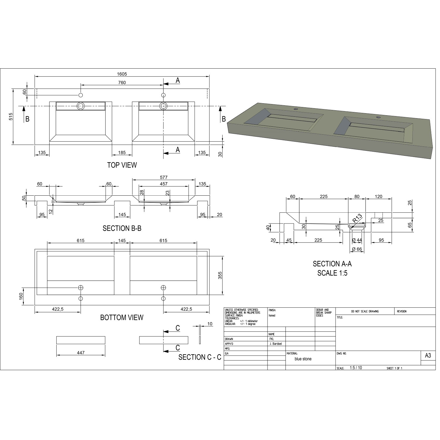 De wastafel wordt geleverd met kraangat waardoor u een opbouw kraan toe kunt voegen, en heeft een afmeting van 160,5x51,5x9 cm. Waarbij de breedte 160,5 cm is, de diepte 51 cm en de hoogte 9 cm. Daarnaast heeft het afvoergat van de wastafel een diameter van 44 mm.