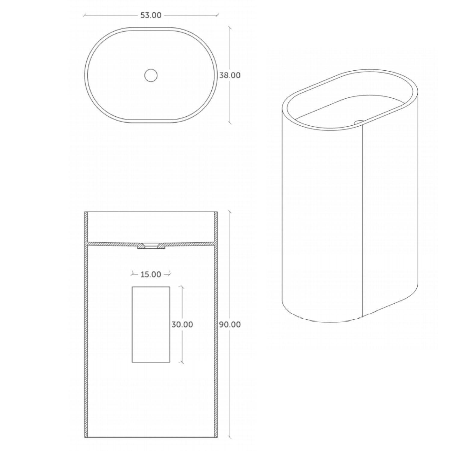De afmetingen van deze vrijstaande wastafel zijn; 90 cm hoog, 53 cm breed en 38 cm diep. Het materiaal Solid Surface is een composiet geproduceerd uit mineralen en harsen. Het is een niet poreus materiaal en heeft een intense kleur. Omdat het door en door van hetzelfde materiaal is gemaakt kunnen eventuele krassen die ontstaan zijn makkelijk weg gepolijst worden.