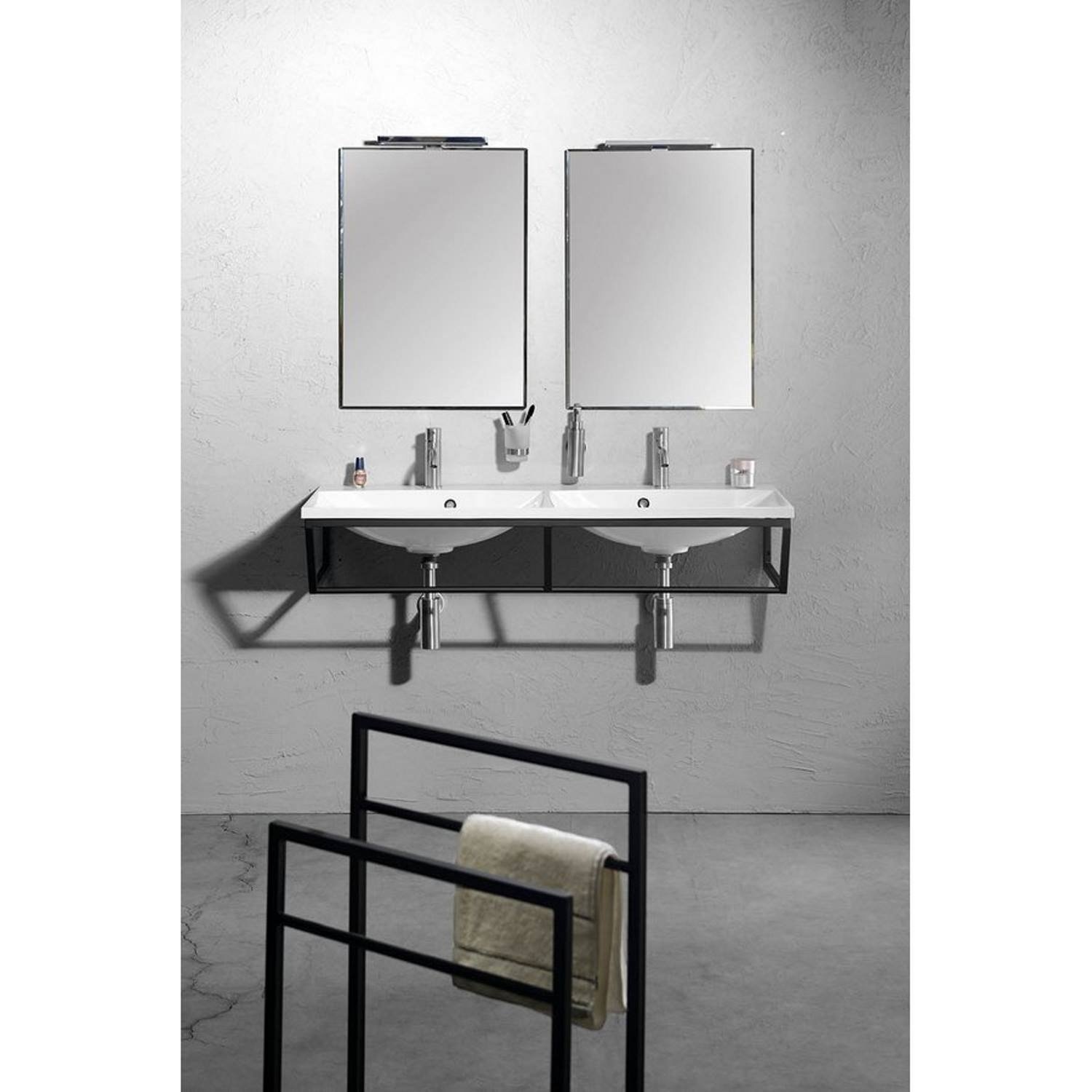 De wastafel beschikt over 2 kraangaten in het midden en een overloop. Het product heeft een breedte van 120 cm en een diepte van 46 cm. De wastafel is speciaal voor de SKA114, SKA104, SKA214 of de SKA204 ophangbeugel. Deze ophangbeugel is verkrijgbaar in de kleur wit en zwart.