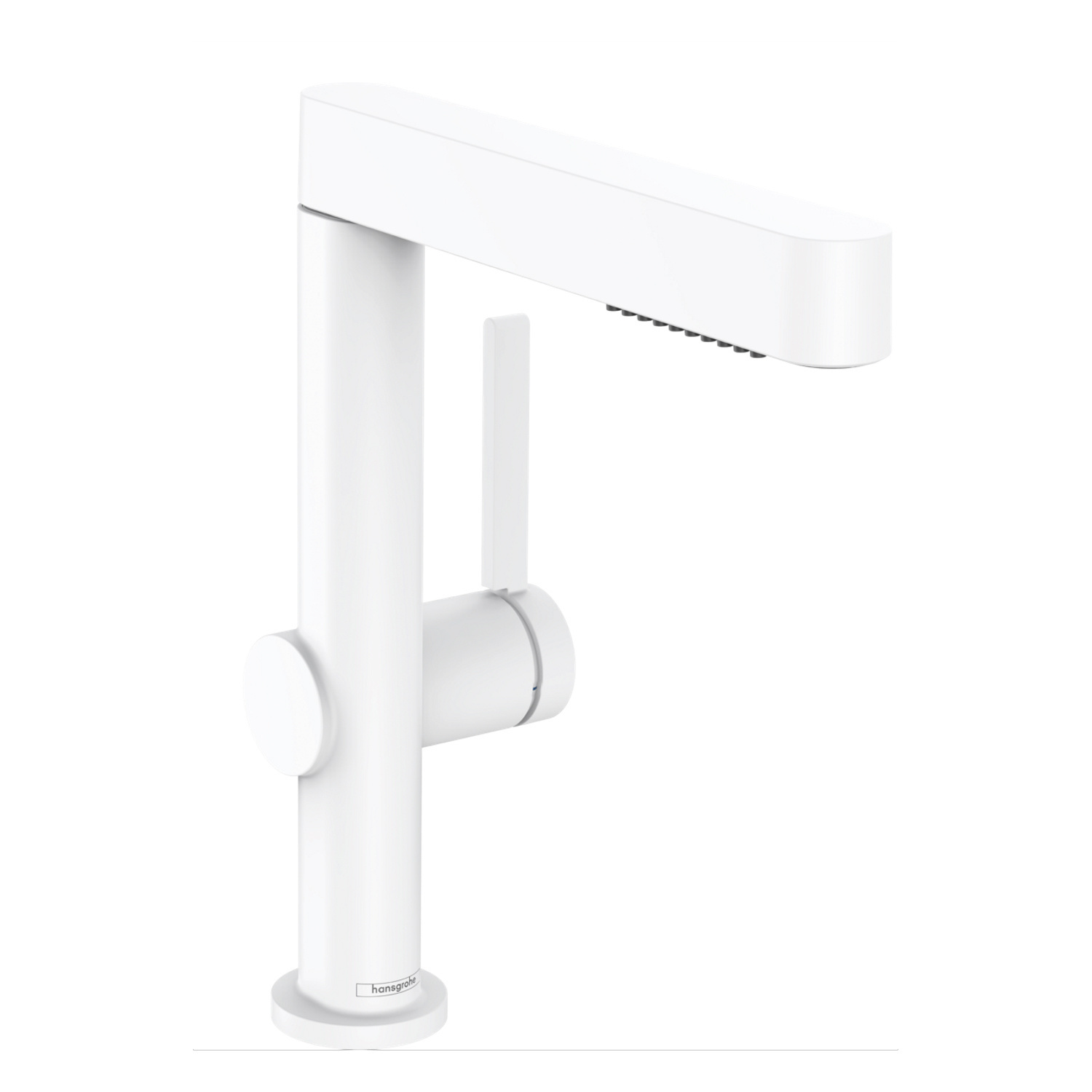 Deze bijzondere wastafelkraan komt uit de Finoris Collectie van HansGrohe. De unieke kraan bevat 2 verschillende jets en heeft een uittrekbare uitloop. De kraan heeft in 2021 een Design Award gewonnen en is in datzelfde jaar Reddot winner geworden. Met een ComfortZone van 230 heeft u altijd genoeg ruimte om de kraan royaal te gebruiken. Producten met het ComfortZone kenmerk zijn ontworpen met uitgekiende techniek en royale afmetingen voor extra comfort. HansGrohe staat bekend om innovatieve technieken en dat is ook zeker het geval met deze kraan. Bespaar water- en energiekosten dankzij de EcoSmart technologie. In vergelijking met gebruikelijke kranen verbruikt deze kraan tot maar liefst 60 procent minder. Maak uw kraan gemakkelijk schoon dankzij de QuickClean technologie. Geniet van een fluisterstille en heldere straal dankzij de laminaire perlator. Deze straalsoort voorkomt opspattend water voor optimaal gemak. Kalkaanslag verdwijnt als sneeuw voor de zon dankzij de flexibele siliconen noppen. Wrijf simpelweg over de noppen om vuil te verwijderen. De bediening van de kraan is ultiem gemakkelijk, dankzij de uittrekbare vuistdouche met een uittreklengte van maar liefst 50 centimeter. De actieradius wordt hierdoor aanzienlijk vergroot. De vuistdouche bevat een brede PowderRain straal die ideaal is om bijvoorbeeld snel uw haren onder de kraan te kunnen wassen. Het wisselen van straalsoort is zeer gemakkelijk met één druk op de knop en automatische straalomstellingen als de kraan wordt gesloten. De magnetische intrekfunctie zorgt ervoor dat de uitloop altijd weer netjes wordt teruggeplaatst.