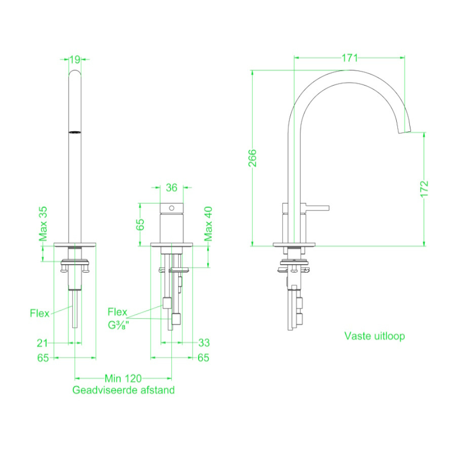 De wastafelkraan heeft een hoogte van 26,6 cm, heeft een hoogte uitloop 17,2 cm, heeft een diepte uitloop 17,1 cm, heeft draadaansluiting van (inch) 3/8 en is een mengkraan met een 2-gats bladmontage.