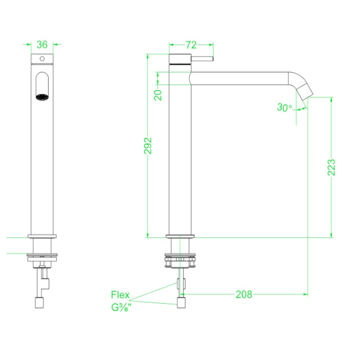 De wastafelkraan heeft een hoogte van 29,2 cm, heeft een hoogte uitloop 22,3 cm, heeft een diepte uitloop 20,8 cm, heeft draadaansluiting van (inch) 3/8 en is een mengkraan.