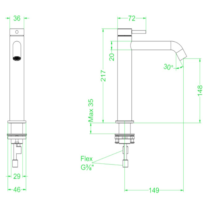 De wastafelkraan heeft een hoogte van 21,7 cm, heeft een hoogte uitloop 14,8 cm, heeft een diepte uitloop 14,9 cm, heeft draadaansluiting van (inch) 3/8 en is een mengkraan.