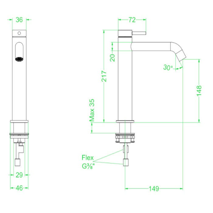 De wastafelkraan heeft een hoogte van 21,7 cm, heeft een hoogte uitloop 14,8 cm, heeft een diepte uitloop 14,9 cm, heeft draadaansluiting van (inch) 3/8 en is een mengkraan.