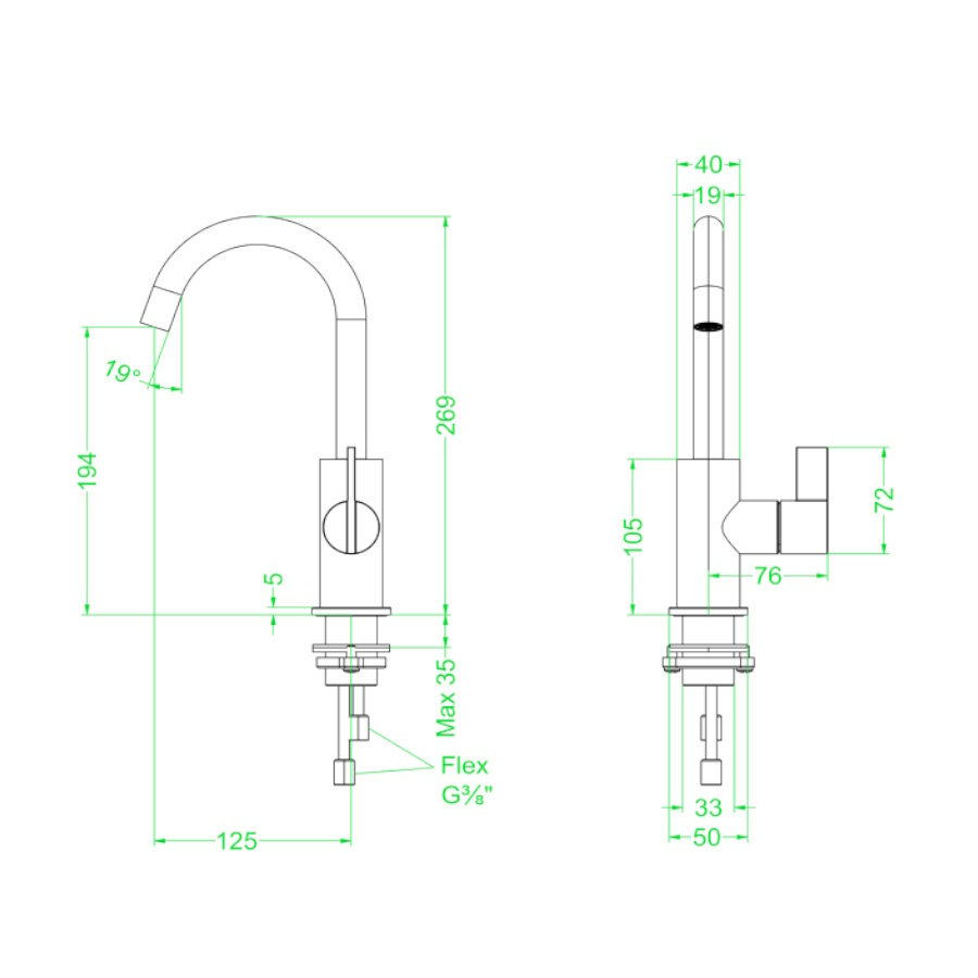 De wastafelkraan heeft een hoogte van 26,9 cm. De kraan heeft een uitloop hoogte van 19,4 cm en heeft een uitloop diepte 12,5 cm. De diameter is 1,9 cm en de maatdraadaansluiting is (inch) 3/8.