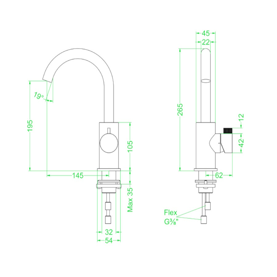De wastafelkraan heeft een hoogte van 26,5 cm, heeft een hoogte uitloop 19,5 cm, heeft een diepte uitloop 14,5 cm, heeft draadaansluiting van (inch) 3/8 en is een mengkraan met een draaibare uitloop.