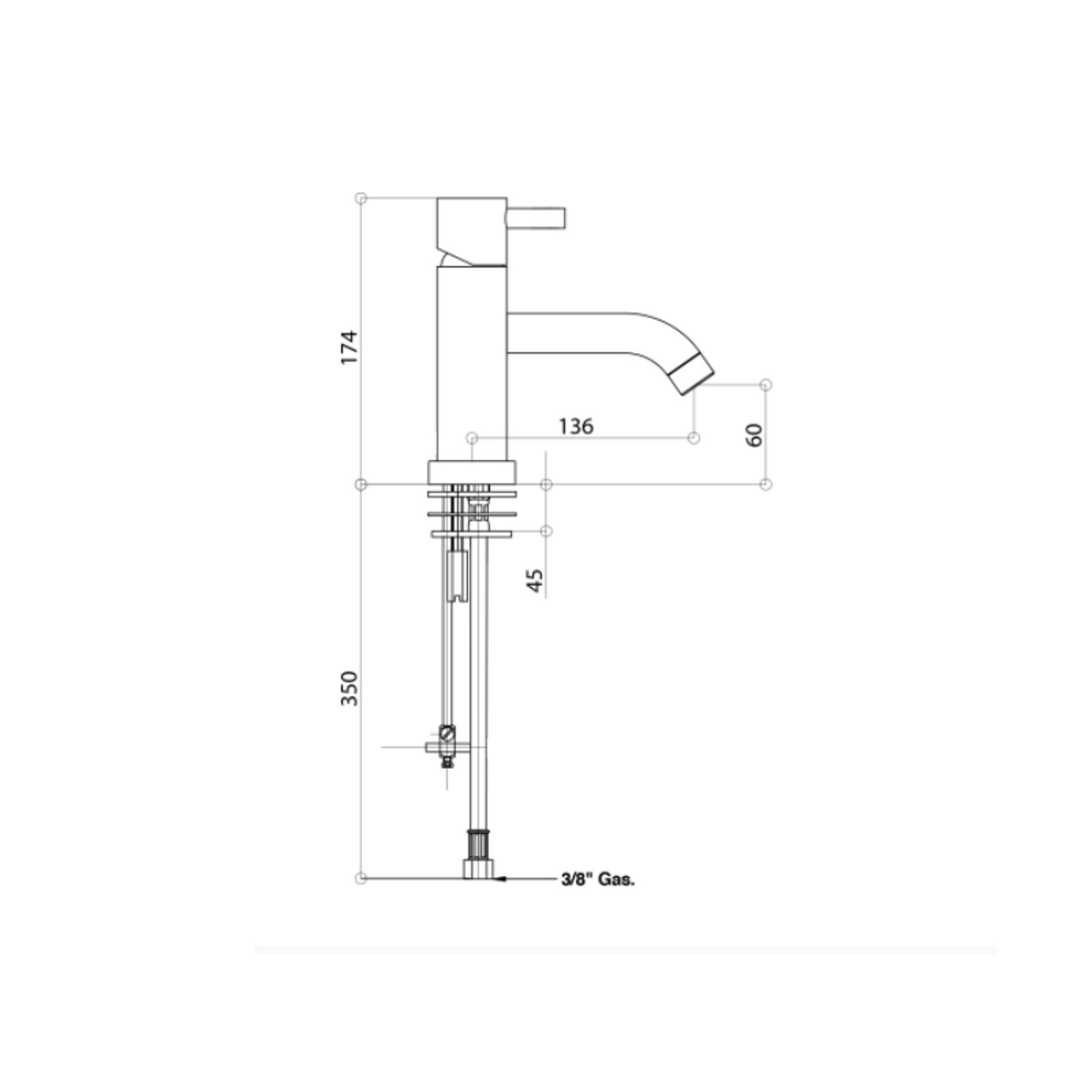 De kraan is 17.4 cm hoog en de hoogte tot aan de uitloop is 6 cm. De lengte van de uitloop en daarmee ook de diepte van de kraan is 13.6 cm. De kraan komt niet met waste. Tot slot heeft de draadaansluiting een maat van 3/8".