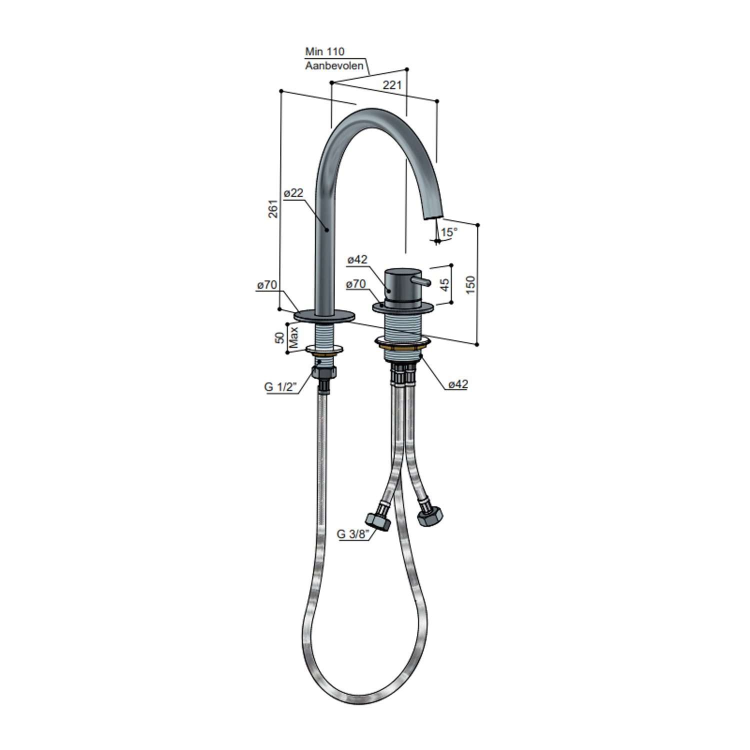 De kraan is 26.1 cm hoog, 2.2 cm breed en is 15 cm hoog tot aan de uitloop.Met een mengkraan draait u aan de hendel om zelf tot de juiste temperatuur te komen. Door de hendel te draaien, wordt warm en koud water met elkaar gemengd tot een gewenste temperatuur. Omdat de kraan ook nog eens beschikbaar is in vele kleuren, is er altijd een uitvoering naar wens en passend bij uw interieur.