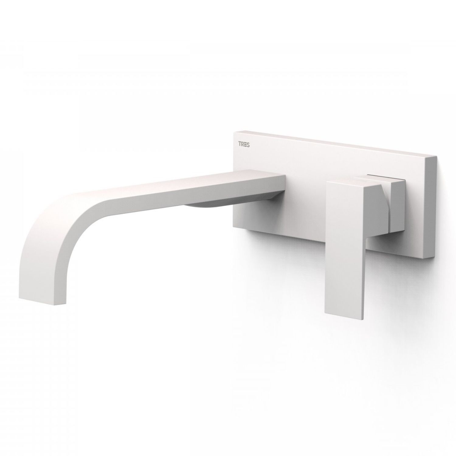 Deze inbouw wastafelkraan van de serie 'Cuadro Exclusive' van Tres heeft een uniek design. De uitloop en hendel bevinden zich op een afdekplaat. De uitloop is gebogen. Deze kraan geeft uw badkamer een moderne touch. Hij is van messing in de kleur wit met matte afwerking. Het is een mengkraan, die u bedient met de hendel. Door de hendel naar voren en achteren te bewegen draait u de kraan open en dicht. Door de hendel naar links en rechts te bewegen mengt u warm en koud water tot de gewenste temperatuur.