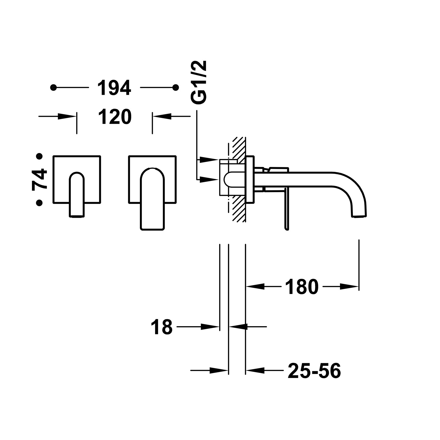 Deze wastafelmengkraan is een mooie toevoeging aan iedere eigentijdse badkamer. Het design is strak en modern. Deze kraan bouwt u in de muur. De kraan bestaat uit een uitloop, een hendel en een inbouwdeel. De afstand tussen de hendel en het inbouwdeel bedraagt 12 cm. De uitloop heeft een lengte van 18 cm. De totale breedte is 19,4 cm. De kraan heeft een aansluiting van 1/2".