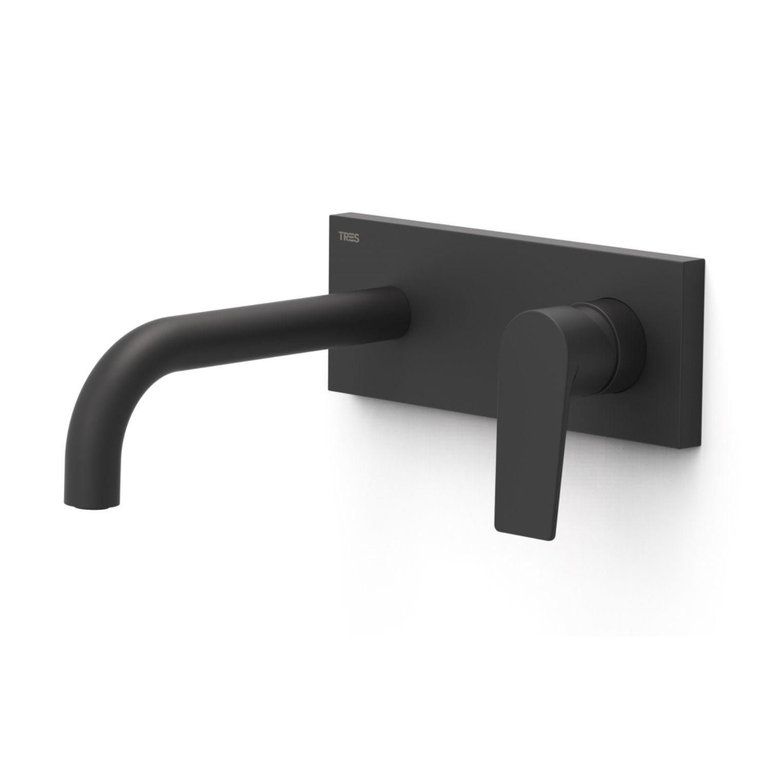 Deze inbouw wastafelkraan van de serie 'Project' van Tres heeft een strak design. De uitloop en hendel bevinden zich op een afdekplaat. De uitloop heeft een ronde vorm en is gebogen. Deze kraan geeft uw badkamer een moderne touch. Hij is van messing in de kleur mat zwart.