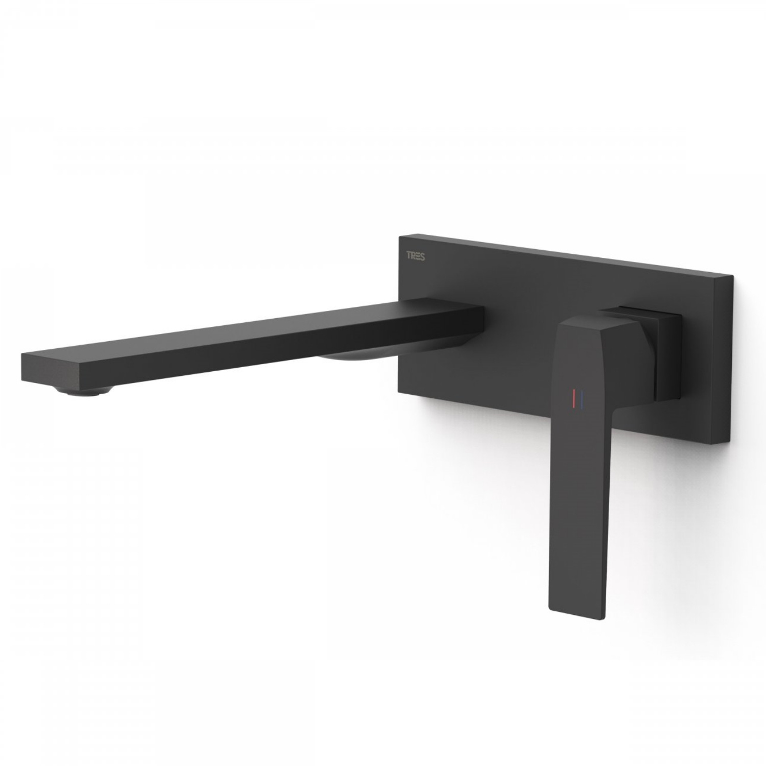 Deze inbouw wastafelkraan van de serie 'Slim Exclusive' van Tres heeft een uniek design. De uitloop en hendel bevinden zich op een afdekplaat. De uitloop is recht, net als de hendel. Deze kraan geeft uw badkamer een moderne touch. Door zijn mat zwarte kleur past hij ook erg mooi bij een industriële of stoere woonstijl.