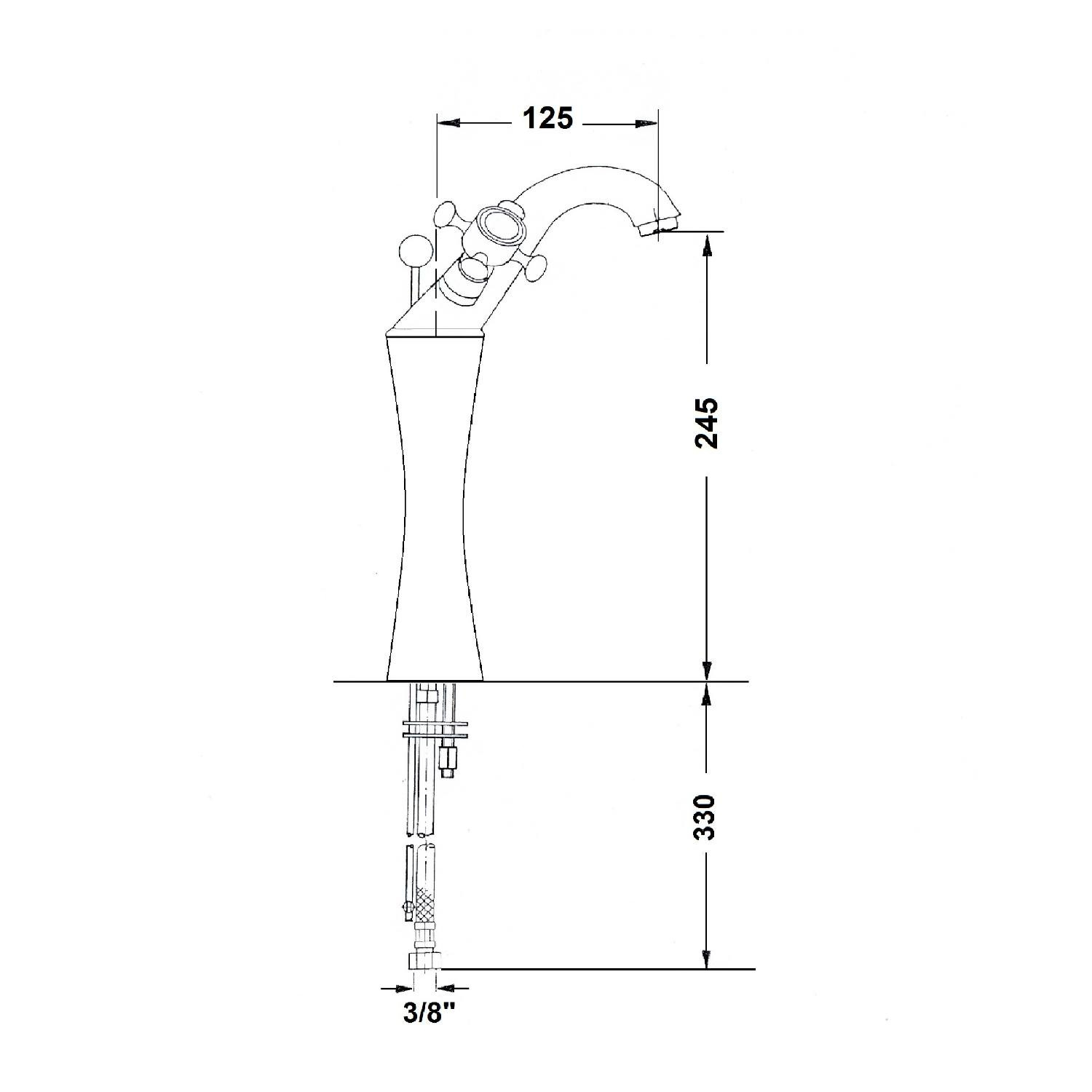 De uitloop heeft een hoogte van 24.5 cm en een diepte van 12.5 cm. De mengkraan is voorzien van een 3/8 inch aansluiting.