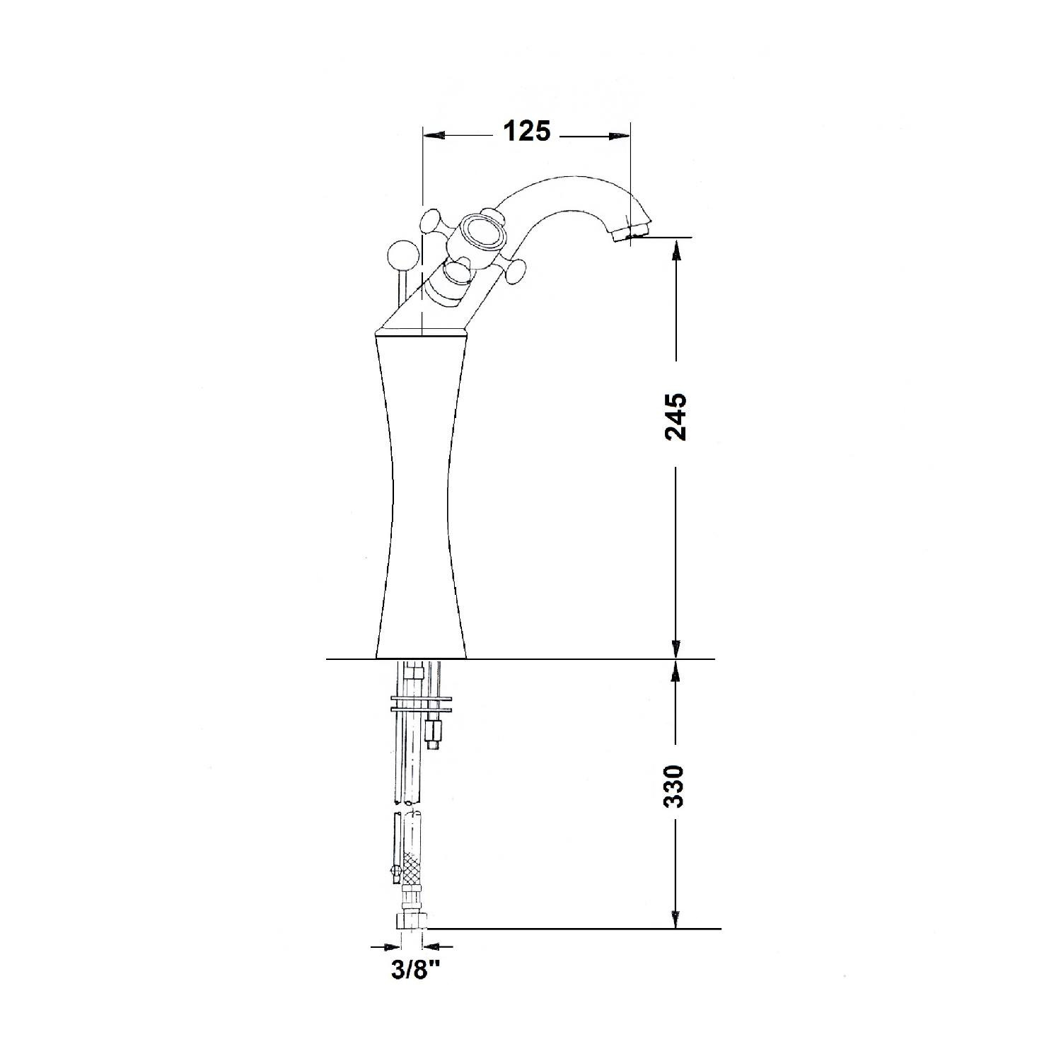 De uitloop heeft een hoogte van 24.5 cm en een diepte van 12.5 cm. De mengkraan is voorzien van een 3/8 inch aansluiting.