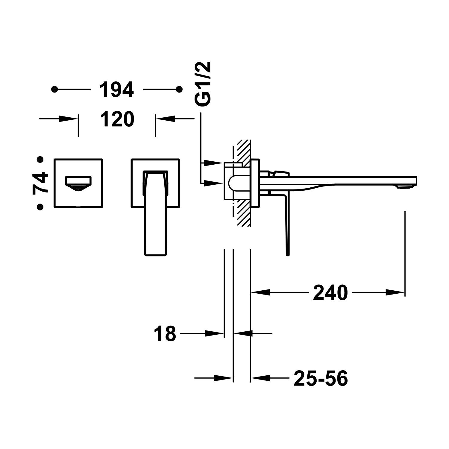 De kraan bestaat uit twee delen: de uitloop en de hendel. De afstand tussen deze twee is 12 cm. De uitloop is 24 cm lang.